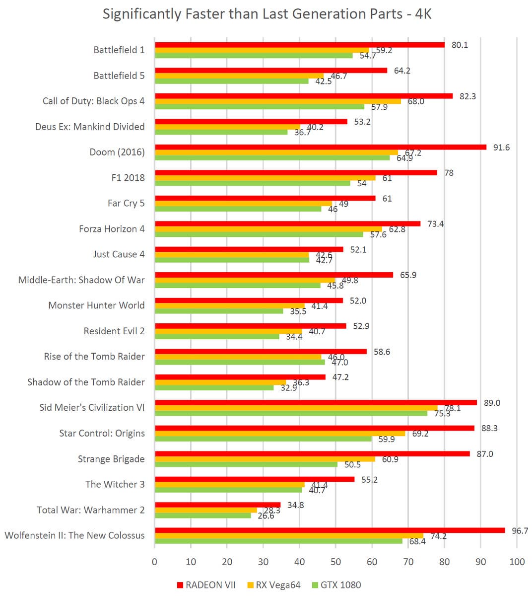 Все архитектурные улучшения RDNA по сравнению с GCN привели к тому, что эффективность (общая производительность GPU при равной тактовой частоте) выросла на четверть, а энергоэффективность — на все 50%. При этом, далеко не все преимущество было достигнуто при помощи техпроцесса 7 нм, его вклад составил лишь около 25%-30%, а остальной прирост был достигнут за счет архитектурных улучшений в RDNA и модернизированной системы питания.
