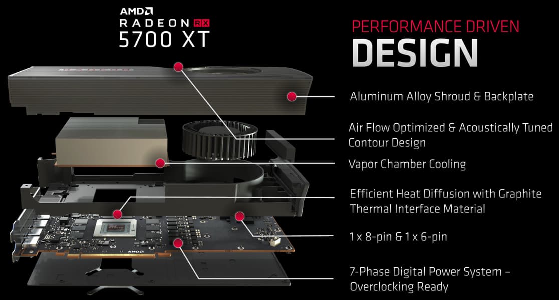 В отличие от обычной Radeon RX 5700, которая похожа скорее на Radeon VII, дизайн корпуса старшей модели XT был переделан, он имеет явную «вмятину» на одной из граней, которая смотрится довольно забавно. В остальном, это кулер того же стиля, что и во всех предыдущих продуктах компании на протяжении многих лет — с испарительной камерой, отводящей тепло от GPU к радиатору. Конечно, кулер оптимизирован по сравнению с его предшественниками, для достижения лучшего охлаждения и меньшего шума. Все равно в нестандартных видеокартах партнеров компании применяются другие решения.
