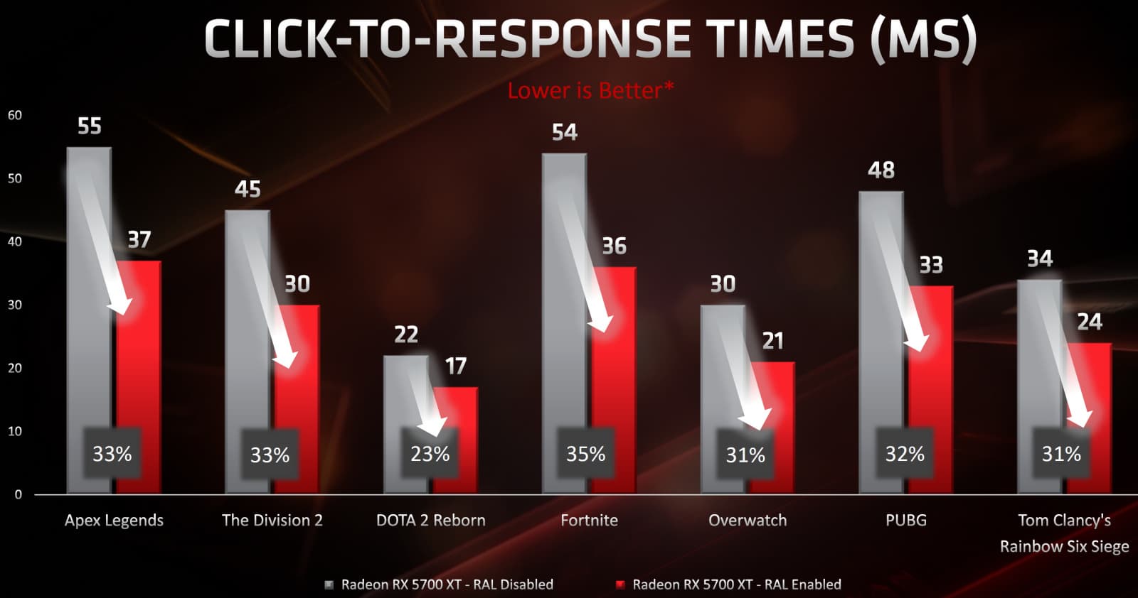 По данным AMD, с включением Radeon Anti Lag, в подобных играх время между действием и отображением на экране становится на треть меньше. Вместо 45-55 мс в некоторых играх получается 30-37 мс, что будет заметно игрокам высокого уровня. Особых технических деталей реализации в AMD не раскрывают, но по описанию работы похоже, что все делается программно в драйвере — он слегка притормаживает очередь кадров на CPU и приводит возможности CPU и GPU к единому целому, что и улучшает отзывчивость.