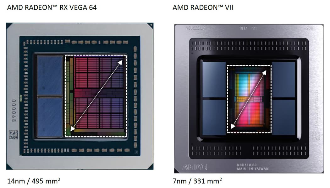 Давайте наглядно сравним площади чипов семейства Vega двух разных поколений: предыдущего с площадью 495 мм² и нового, уместившегося в 331 мм² благодаря самому совершенному на сегодняшний день техпроцессу: