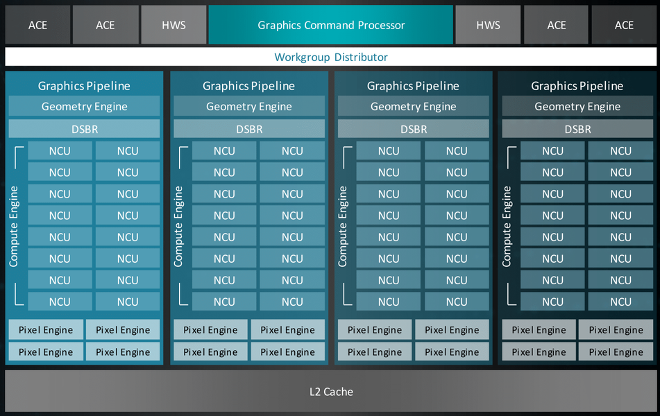 Хотя архитектура действительно новая, но базовые блоки в ней — это все те же вычислительные блоки Compute Unit (CU), из которых собраны все современные графические процессоры AMD. Каждый CU имеет выделенное локальное хранилище данных для обмена данными или расширения локального регистрового стека, а также кэш-память и полноценный текстурный конвейер с блоками выборки и фильтрации. Каждый из таких блоков самостоятельно занимается планированием и распределением работы. Рассмотрим схему полноценной версии чипа: