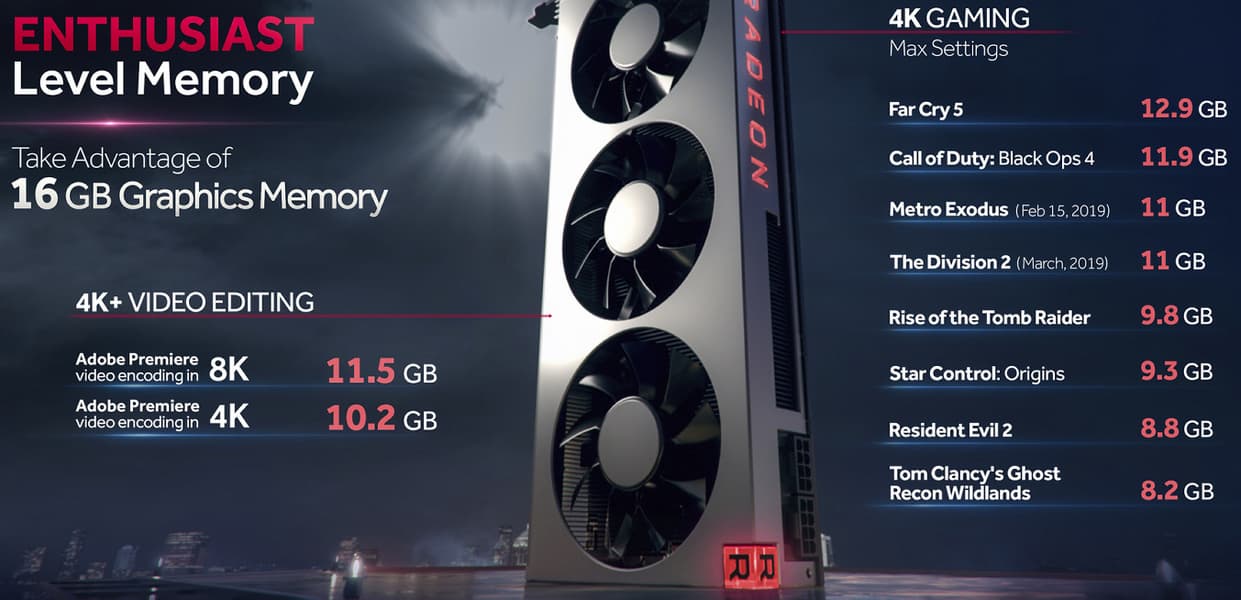 Видеокарты модели Radeon VII продавались исключительно в референсном виде несколькими партнерами компании. Чтобы дополнительно привлечь игроков, в комплекте с новой топовой видеокартой предлагалось сразу три современные игры (две из которых еще даже не вышли): Devil May Cry 5, The Division 2 и Resident Evil 2. Конкурент в лице GeForce RTX 2080 предлагал свой комплект: Anthem, Battlefield V и Metro Exodus, и выбор из них — дело вкуса.