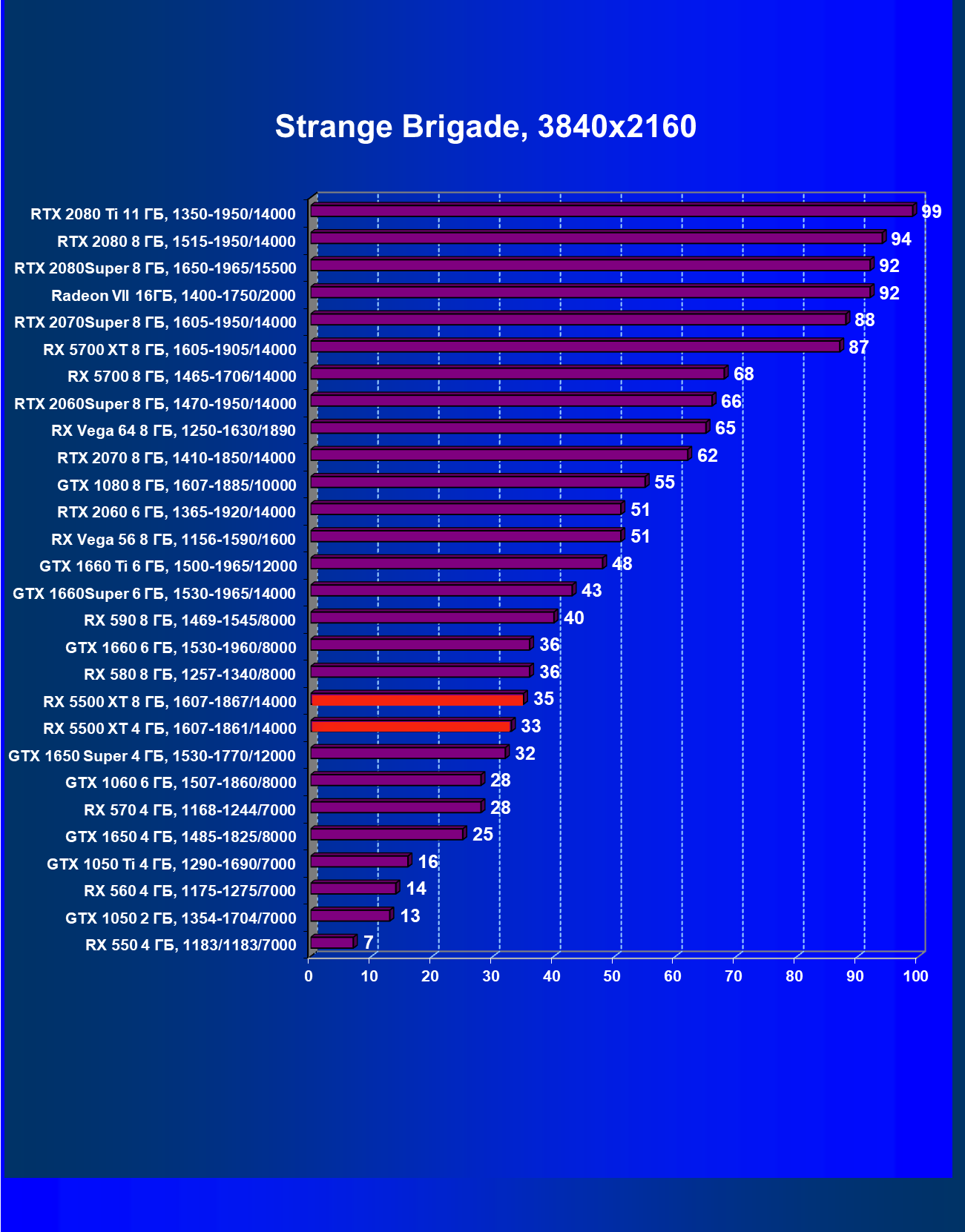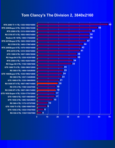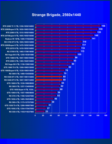 | 20 | RX 5500 XT 4 ГБ, 1607—1861/14000 | 420 | 326 | 12 900 |