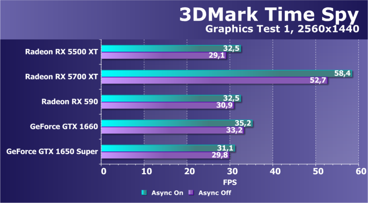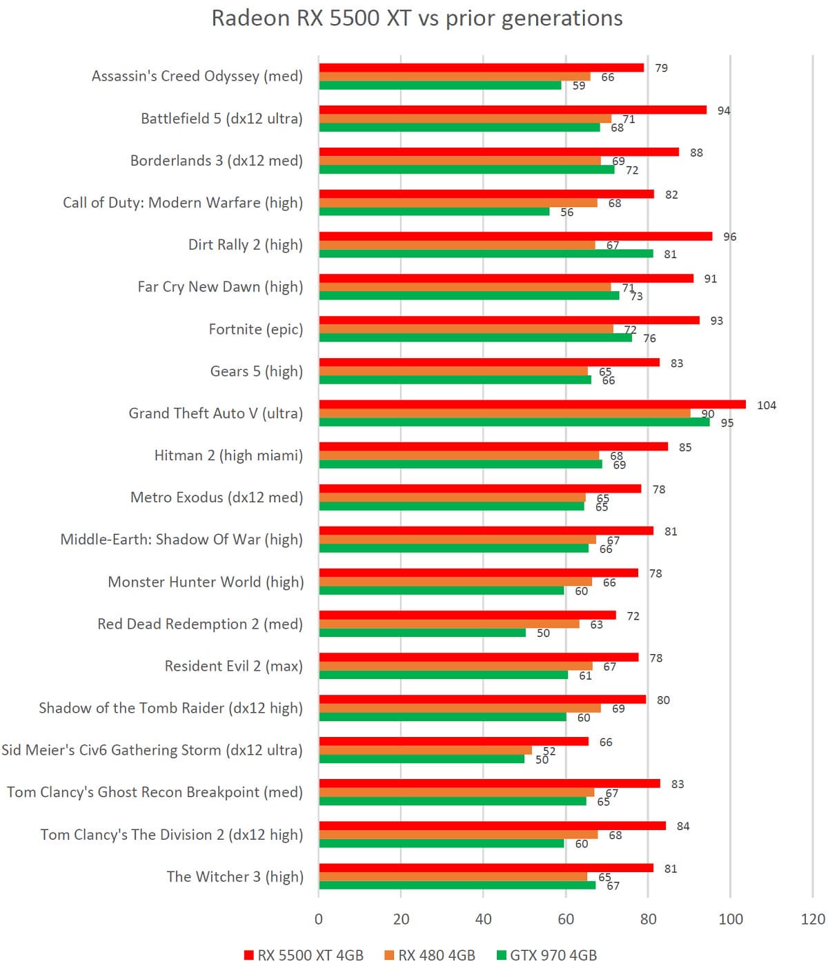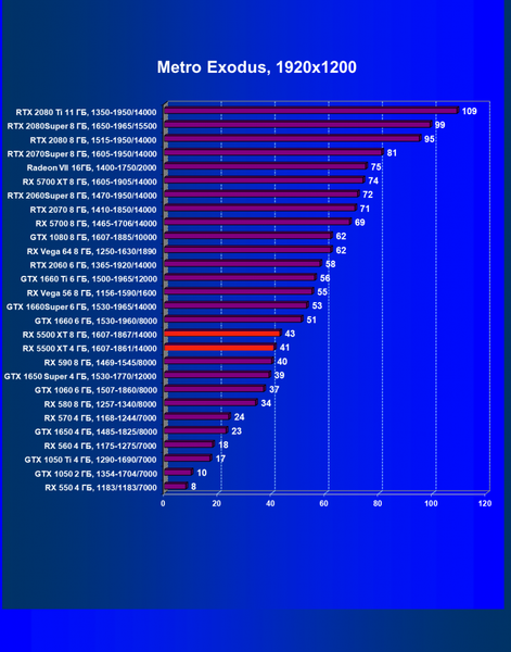 Radeon RX 5500 XT оказался неплохой заменой для них, предлагая производительность, близкую к уровню Radeon RX 580, не уступая по объему видеопамяти и почти не уступая по ее пропускной способности (с учетом всех оптимизаций и внутричипового сжатия информации). Сочетание техпроцесса 7 нм и архитектуры RDNA позволили AMD увеличить производительность и серьезно повысить энергоэффективность их графических решений в бюджетном сегменте по сравнению с видеокартами предыдущего поколения.