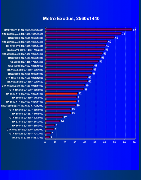 | 11 | RX 5500 XT 4 ГБ, 1607—1861/14000 | 326 | 420 | 12 900 |