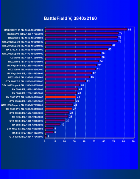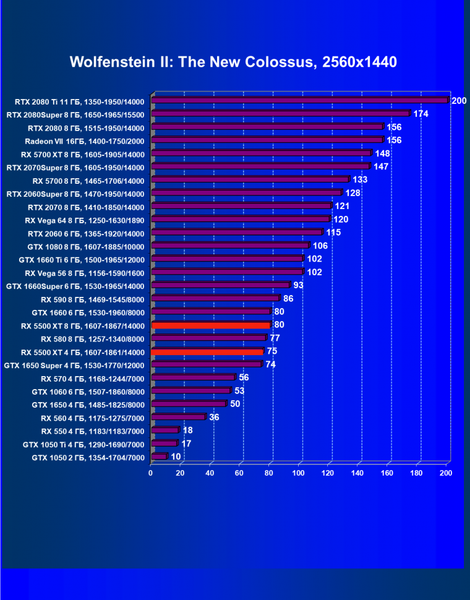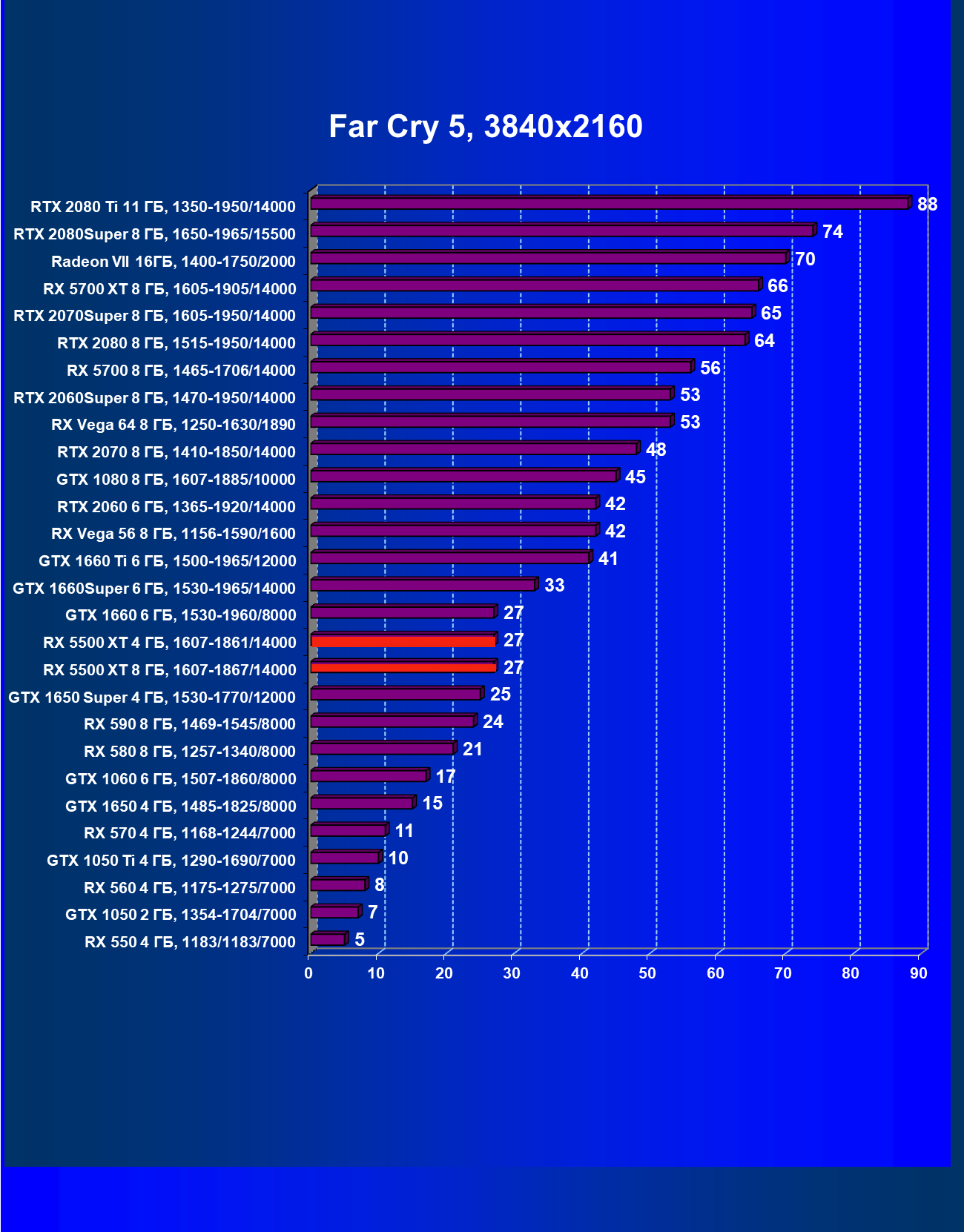 | 13 | RX 5500 XT 8 ГБ, 1607—1867/14000 | 310 | 450 | 14 500 |