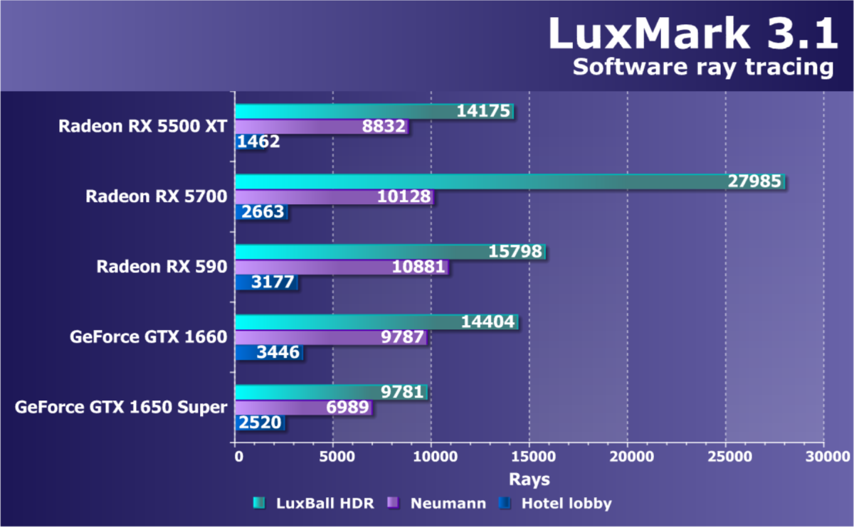 Для анализа производительности новых видеокарт серии Radeon RX 5500 XT мы использовали показатели 8-гигабайтного варианта, так как они незначительно отличались от результатов младшей версии с 4 ГБ памяти. Остальные видеокарты мы выбрали по разным причинам. Так как представители Navi 14 заменяют на рынке решения семейства Polaris, то тестах мы сравнили новинку с самым мощным из представителей семейства в виде Radeon RX 590 — чтобы понять, насколько RDNA эффективнее справляется с представленными задачами. Также мы сравнили новинку и с RX 5700, как старшим решением этой архитектуры на базе урезанного чипа Navi 10.