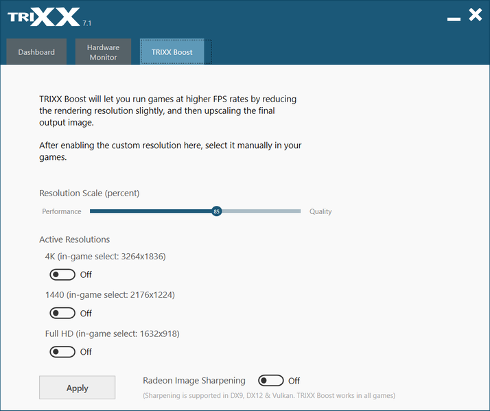 В настройках драйвера задается минимально возможное разрешение в процентах от нормального (50%, 67% или 84%), и падение качества на вид должно быть почти неразличимым при заявленном повышении отзывчивости при игре. Пока что технологией поддерживается весьма ограниченный набор игр: Overwatch, PUBG, Borderlands 3, последние две игры серии Tomb Raider, Destiny 2, GTA 5 и Call of Duty: WWII — и все они только в DirectX 11-версиях, на данный момент. Технология работает на видеокартах, начиная с Radeon RX 400 (Polaris) и Raven Ridge APU.