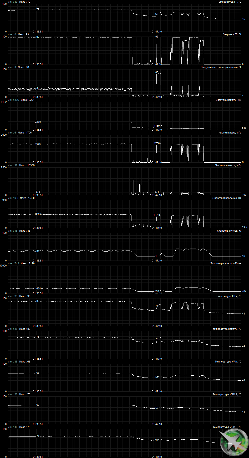 После 6-часового прогона под нагрузкой максимальная температура ядра не превысила 78-81 градуса у обеих карт, что является приемлемым результатом для видеокарт такого уровня.