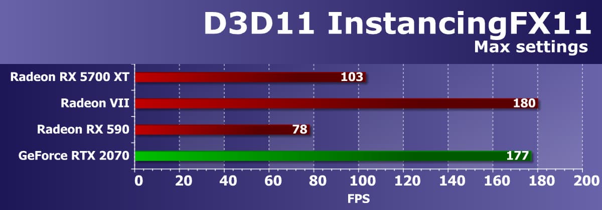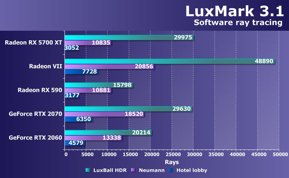 Для анализа производительности новых видеокарт серии Radeon RX 5700, мы выбрали другие видеокарты по разным причинам. Так как представители Navi заменяют на рынке решения семейства Vega, то в части тестов мы сравнили новинки с Vega 64 и ее более новым вариантом в виде Radeon VII. Также мы взяли для сравнения с RX 5700 и самого мощного из представителей семейства Polaris в виде Radeon RX 590 — чтобы понять, насколько Navi эффективнее справляется с представленными задачами.
