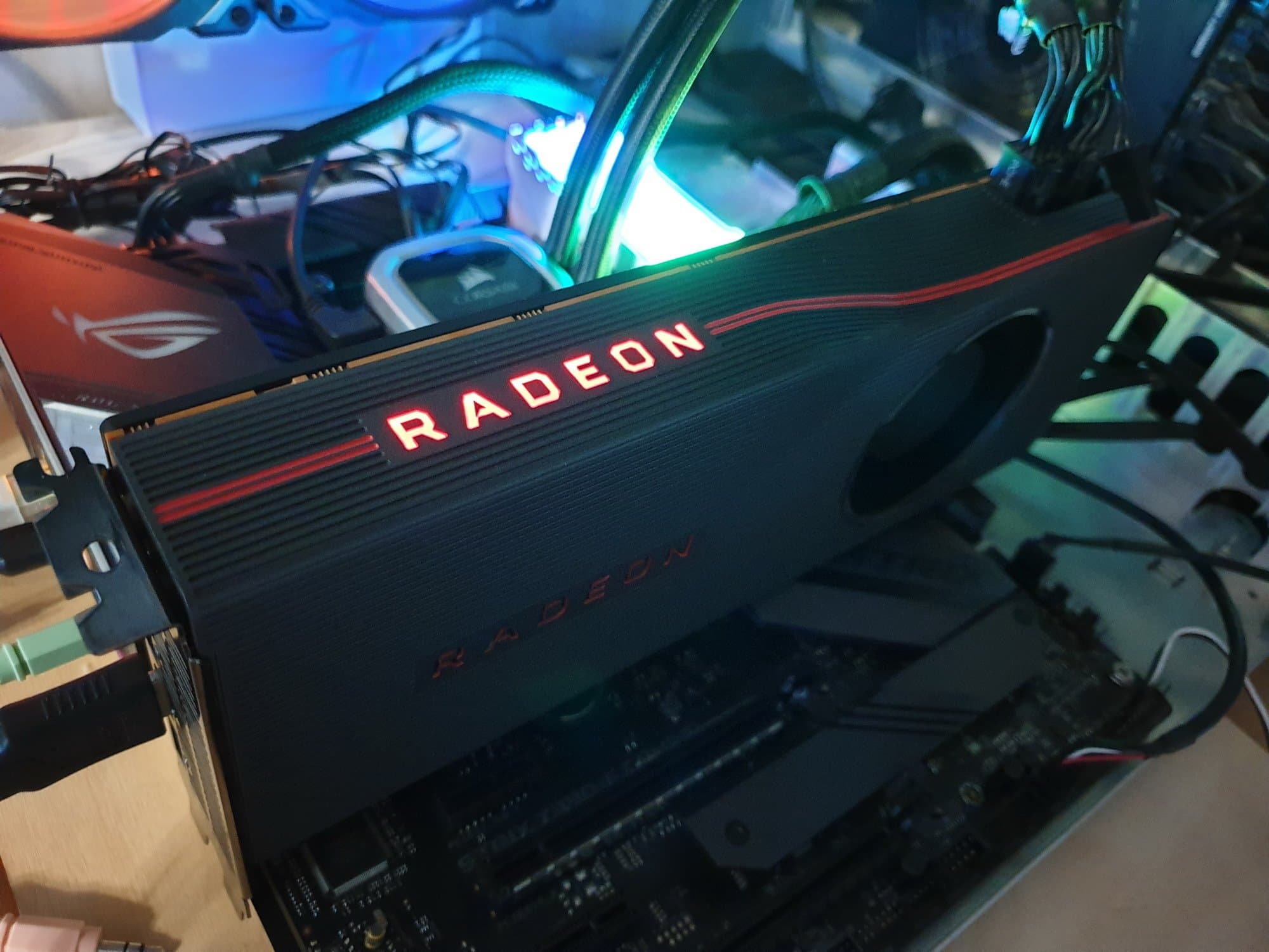 Подсветка имеется только у RX 5700 XT: очень скромная, не регулируется и представляет собой лишь слово Radeon на торце карты.