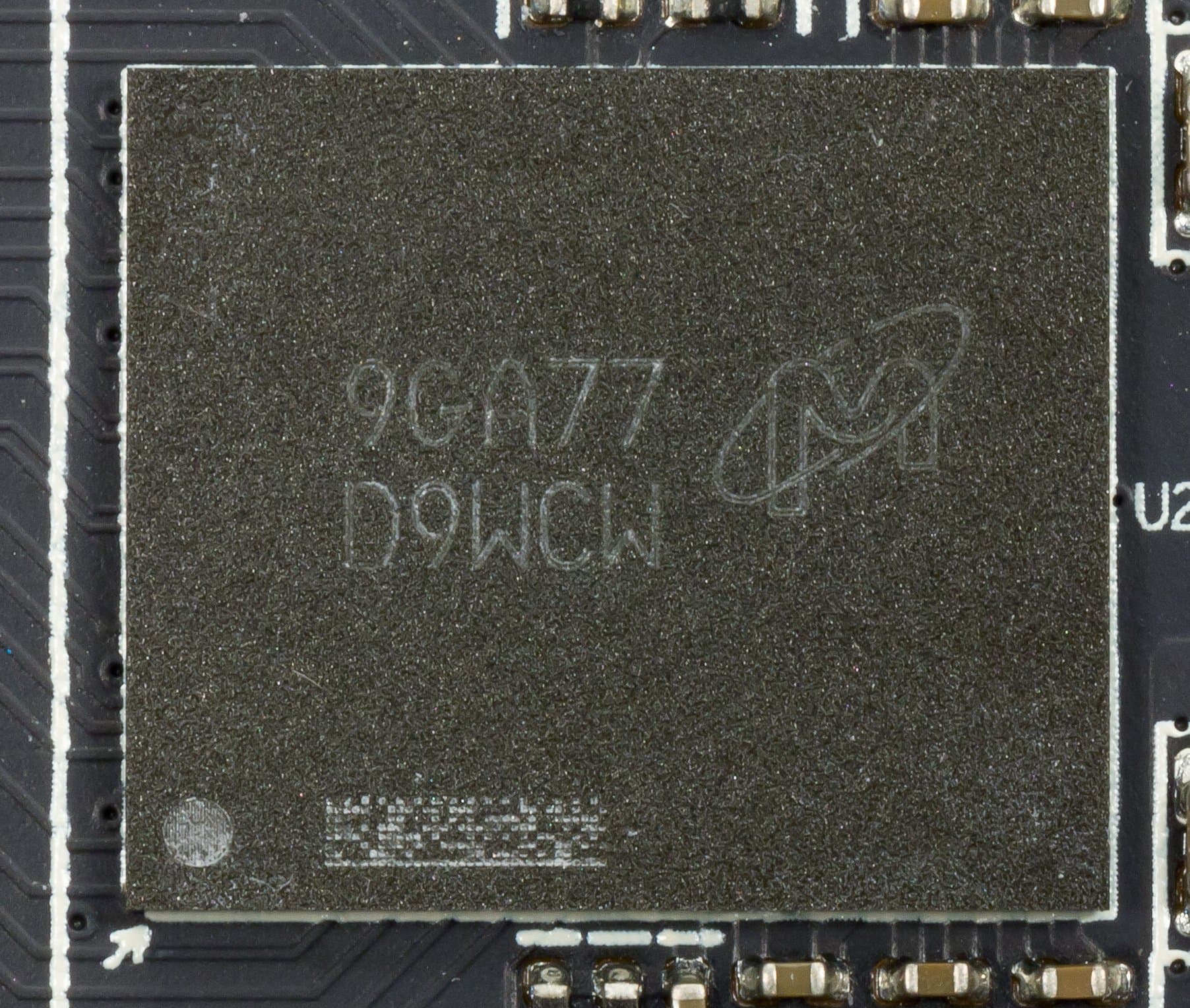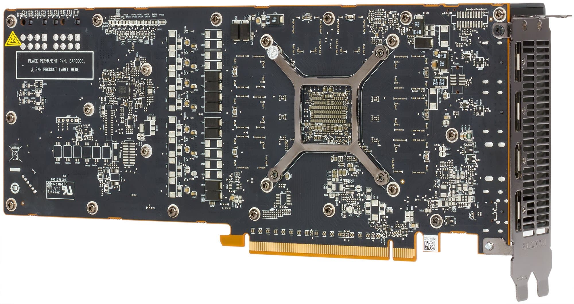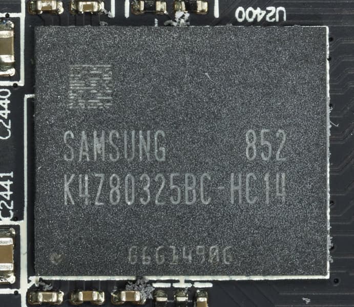 Каждая карта имеет по 8 ГБ памяти GDDR6 SDRAM, размещенной в 8 микросхемах по 8 Гбит на лицевой стороне PCB. Микросхемы памяти Samsung и Micron (GDDR6) рассчитаны на номинальную частоту работы в 3500 (14000) МГц