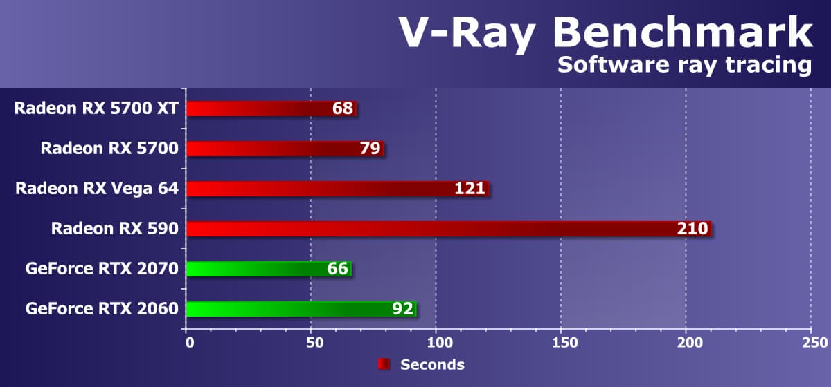 Мы сравниваем с RX 590 по двум простым причинам: во-первых, это самый быстрый ускоритель среднего класса, выпущенный AMD до сего момента (теперь же пара RX 5700/5700 XT займет свои места между RX 590 и Radeon VII). Во-вторых, все три ускорителя имеют шину обмена с памятью одинаковой ширины.