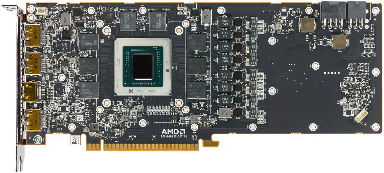 Каждая карта имеет современный привычный набор видеовыходов: 3 DP 1.4 и 1 HDMI 2.0b. Имеется поддержка технологии AMD Radeon FreeSync 2 HDR и частот вертикальной синхронизации 60 Гц в 8К и вплоть до 120 Гц в 4К с HDR и 240 Гц без HDR (разумеется, при наличии соответствующих приемников).