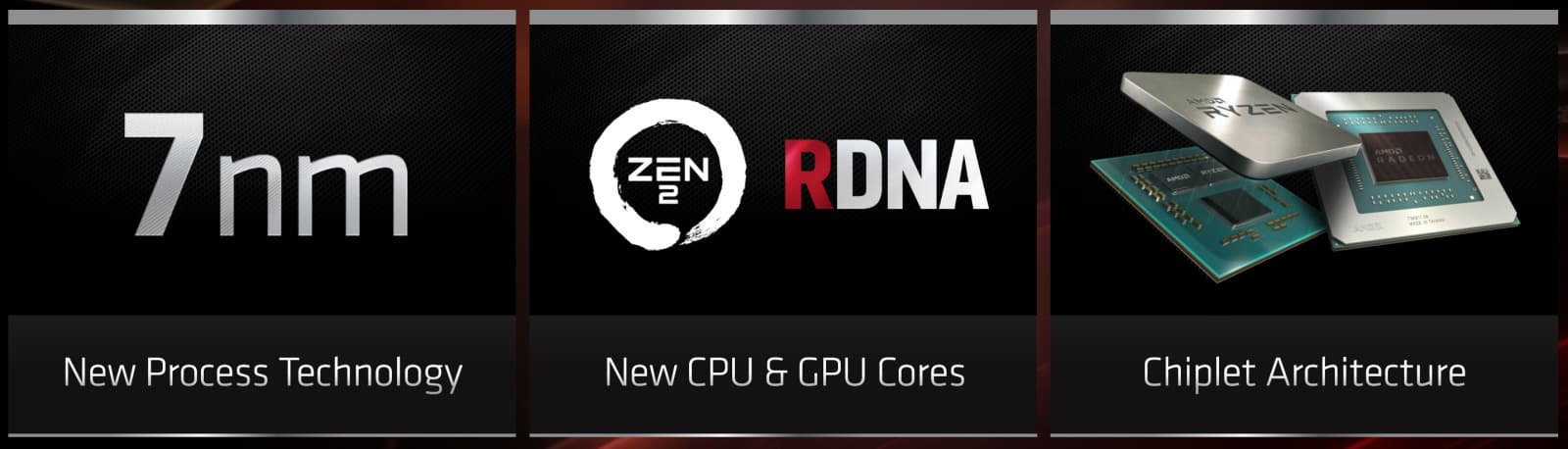 Компания собирается закрепить свой успех выпуском настольных CPU и GPU, созданных с применением самого совершенного на сегодня технологического процесса 7 нм, позволяющего поместить больше транзисторов в чип той же площади, увеличить рабочие частоты и повысить энергоэффективность. Но это не единственная их особенность, в новых продуктах компании AMD используются улучшенные архитектуры Zen 2 и RDNA, а в процессорах применен новаторский чиплетный дизайн, позволяющий вместо одного крупного кристалла сделать чип на основе нескольких более мелких, соединив их высокопроизводительными шинами передачи данных и снабдив большим объемом кэш-памяти. Пока что чиплетный дизайн касается только CPU, но в будущем возможно его применение и для графических процессоров, и уж точно он подойдет для гибридных решений, сочетающих CPU и GPU.