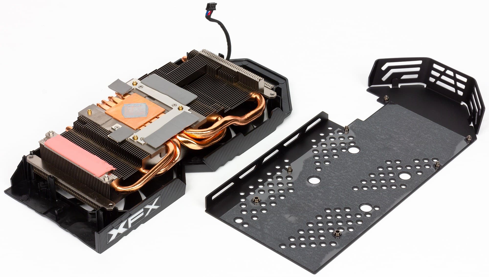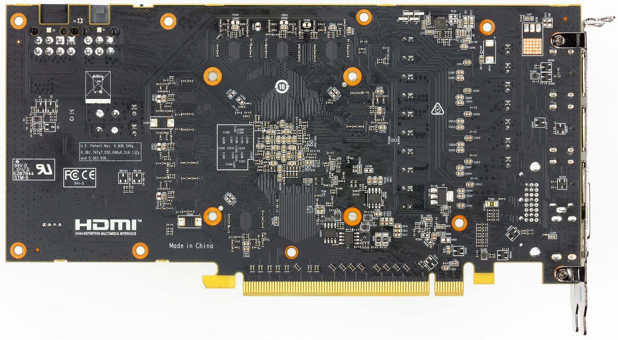 Микросхемы памяти и силовые транзисторы охлаждаются основным радиатором. На обороте видеокарты установлена толстая пластина, которая обеспечивает жесткость относительно массивной видеокарты (предотвращая изгиб печатной платы).