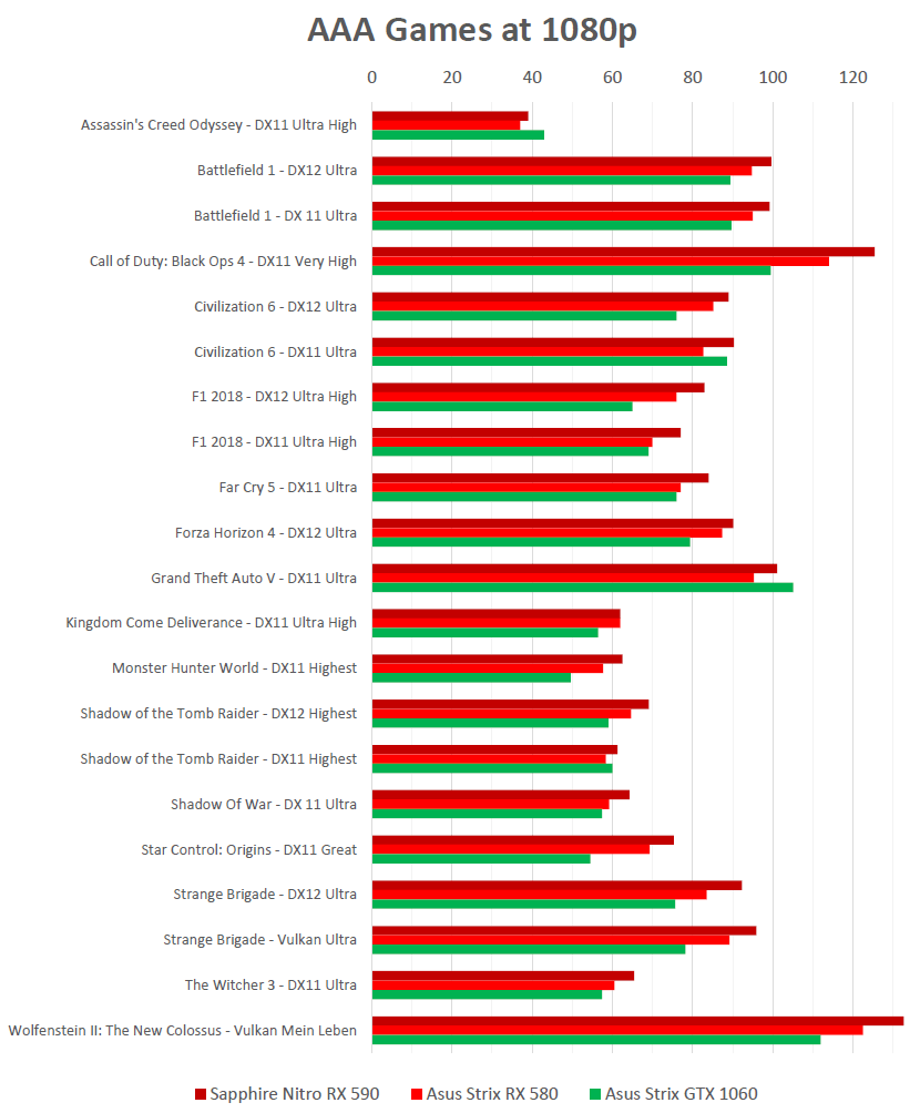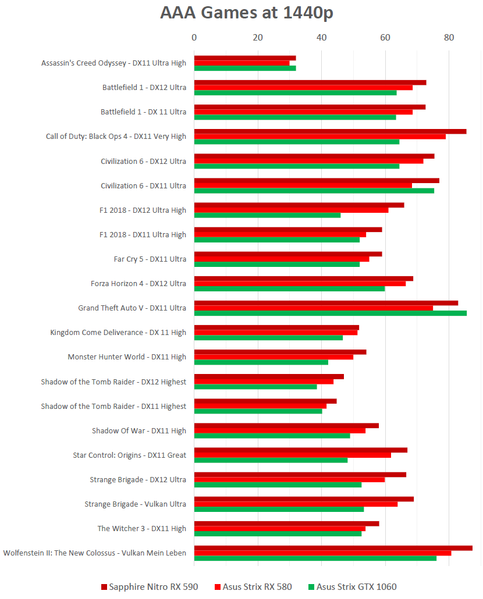 По собственным тестам AMD получается, что типичная видеокарта модели Radeon RX 590 явно обходит их же решение RX 580, а также впереди конкурента из стана Nvidia в подавляющем большинстве тестов. Что еще более важно, новинка обеспечивает частоту кадров 60 FPS и выше при разрешении Full HD почти во всех условиях, кроме единственного случая — ультравысоких настроек для Assasin's Creed Odyssey. Может быть, найдутся и другие сверхтребовательные игры, но для просто высоких настроек мощности RX 590 хватит.