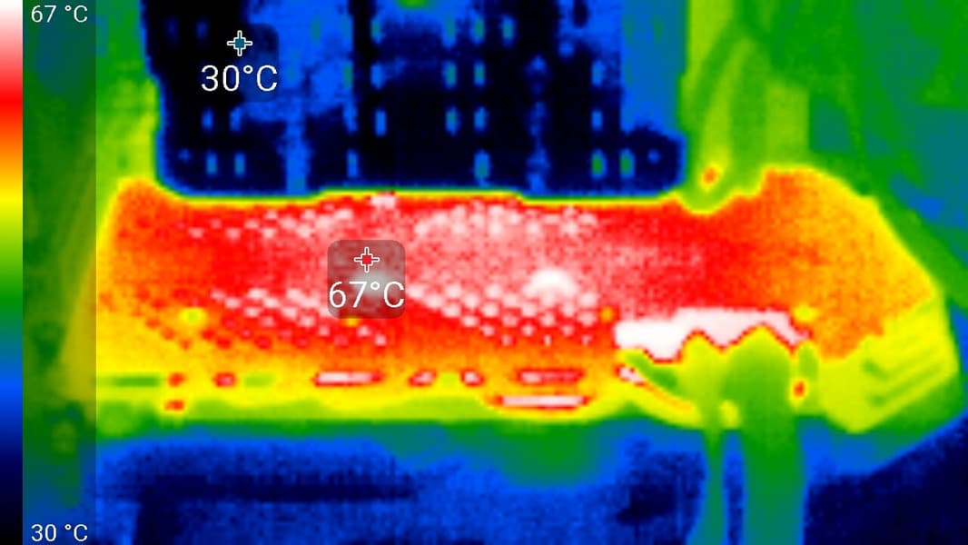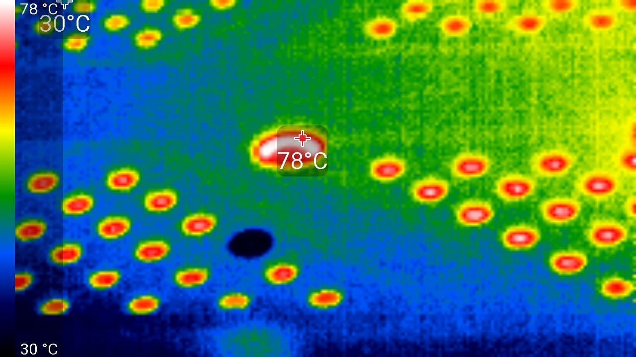 Максимальный нагрев — центральная область с обратной стороны печатной платы.