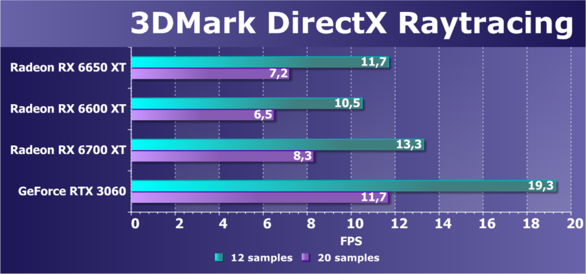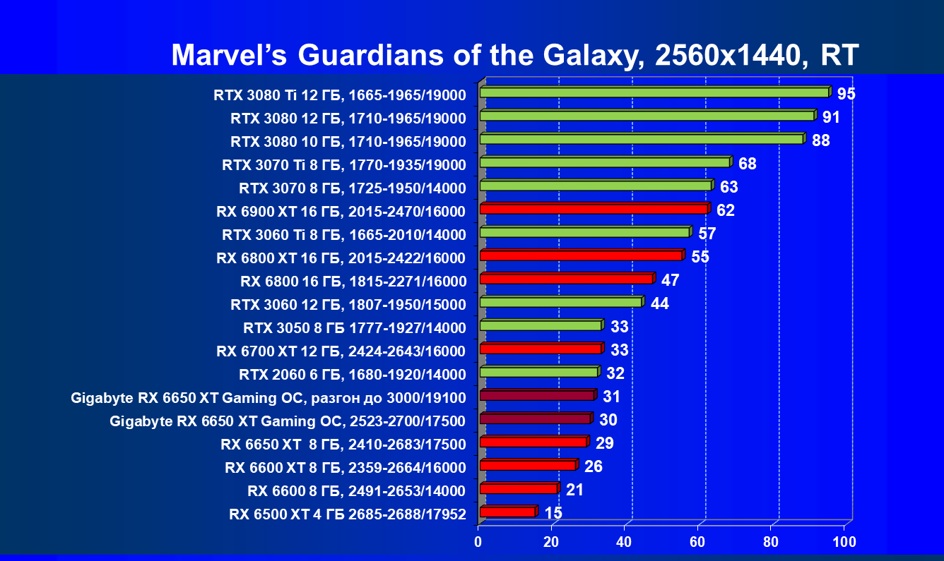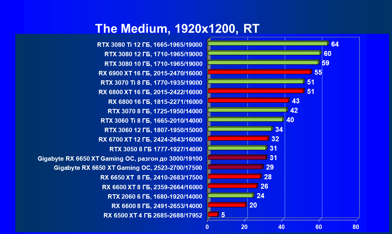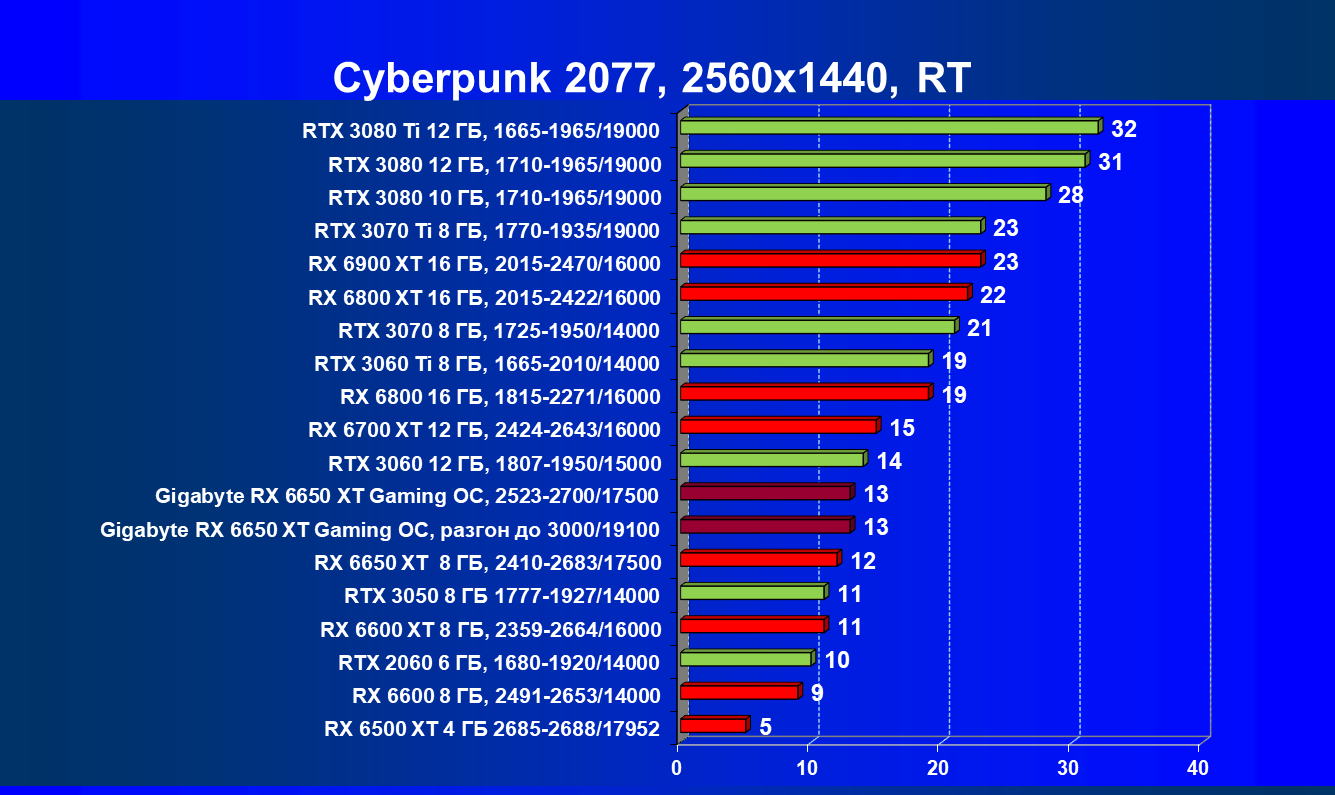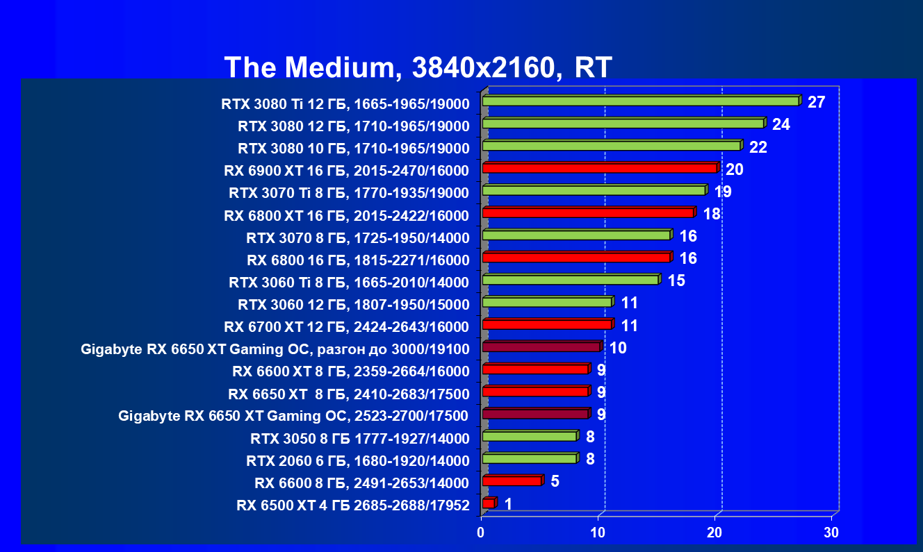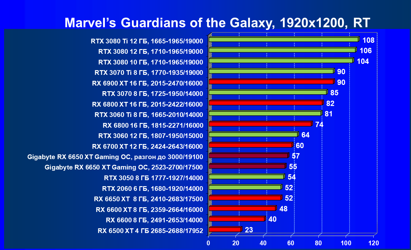 При задействовании трассировки лучей расклад сил поменялся весьма незначительно: GeForce RTX 3060 Ti смог чуть-чуть опередить базовый Radeon RX 6650 XT, однако карта Gigabyte сохранила лидерство в группе, а с разгоном — и в общем зачете.