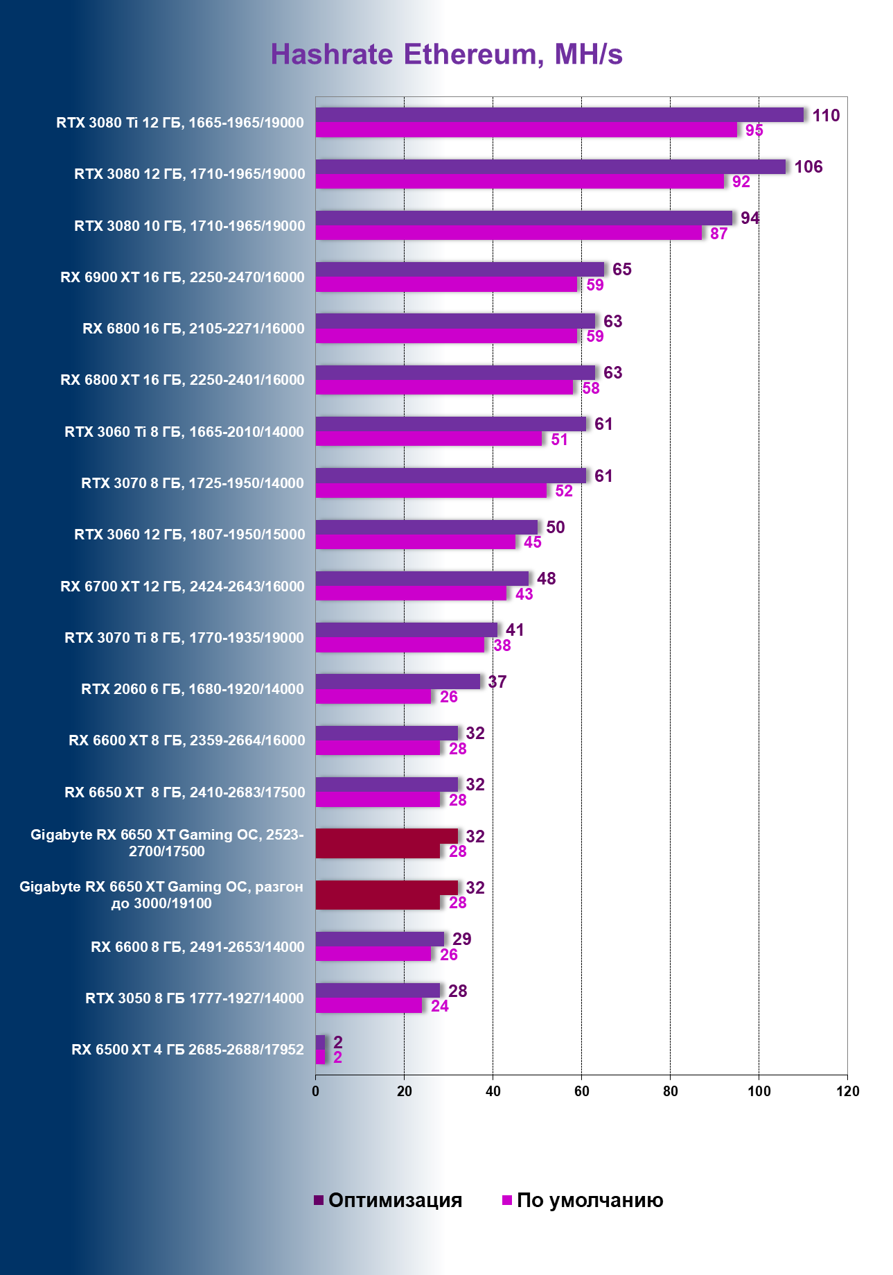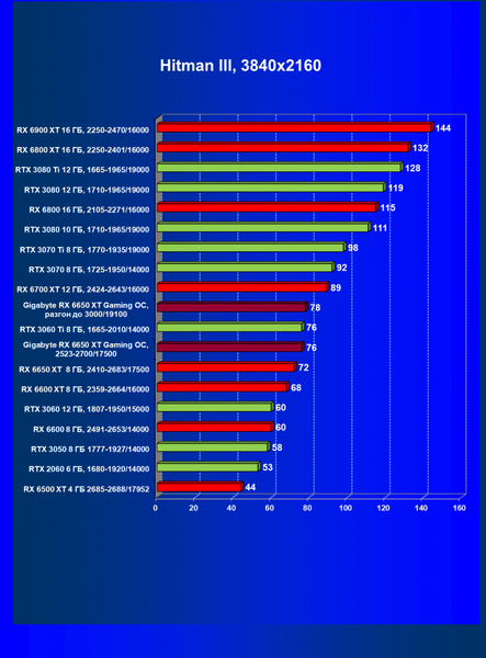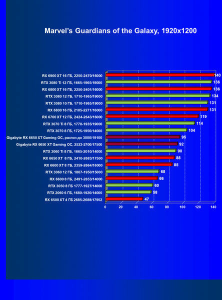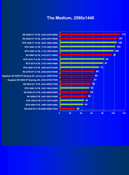 | 04 | Gigabyte RX 6650 XT Gaming OC, 2523—2700/17500 | 47 | 240 | 51 000 |