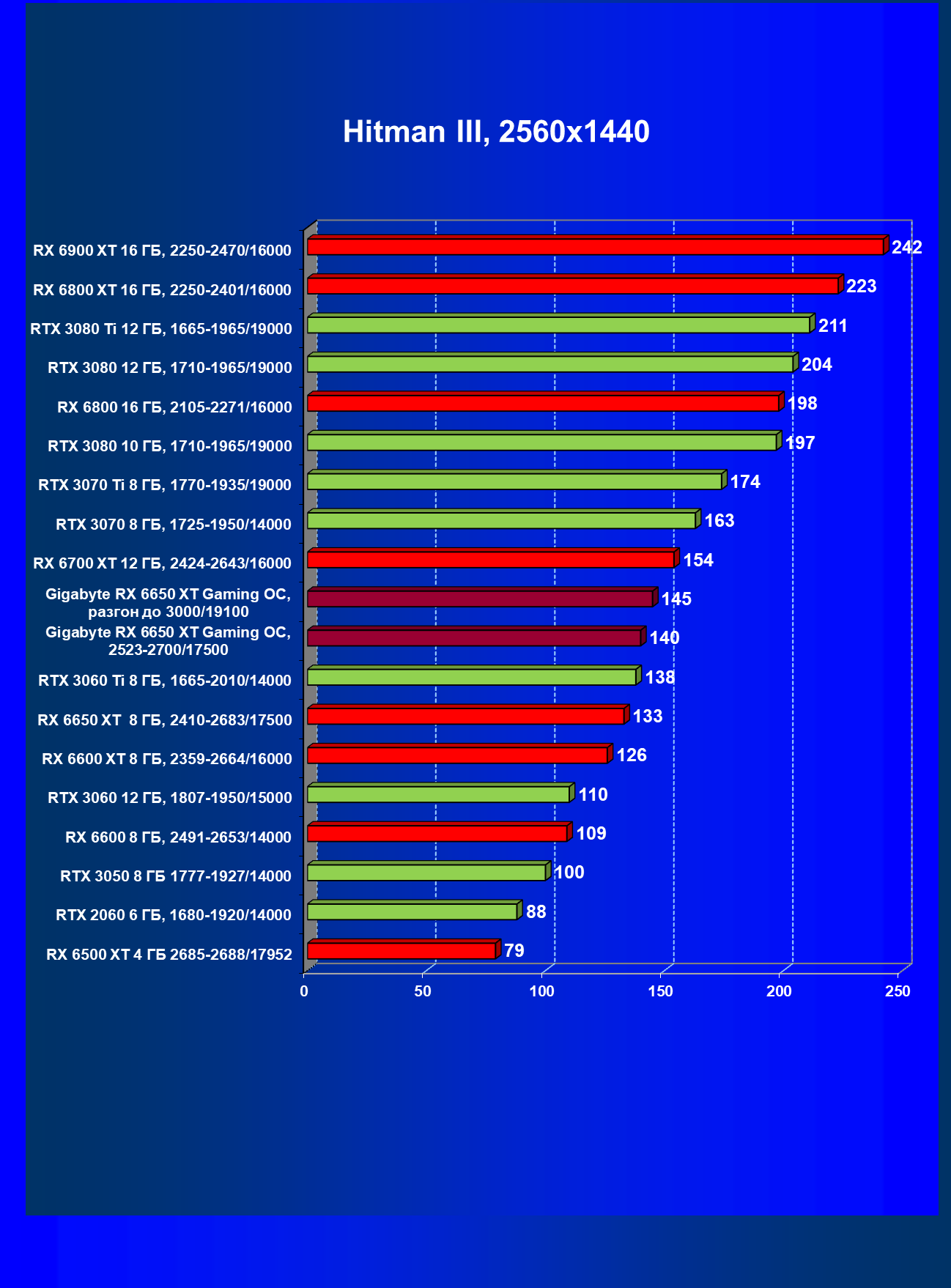 | 05 | RX 6650 XT 8 ГБ, 2523—2683/17500 | 68 | 340 | 50 000 |