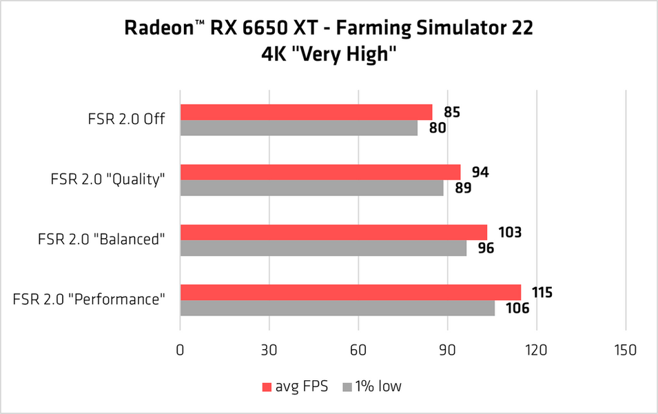 Уже сейчас FSR 2.0 доступна в трех играх: Dealthloop, God of War и Farming Simulator 22, но в ближайшее время список сильно расширится. В него войдут такие проекты, как Asterigos, Delysium, EVE Online, Forspoken, Grounded, Microsoft Flight Simulator, NiShuiHan, Overprime, Perfect World Remake, Swordsman Remake, Unknown 9: Awakening, Abyss World, Hitman 3, Rescue Party: Live!, Super People и The Callisto Protocol. К примеру, в Farming Simulator 22 новая технология позволяет заметно повысить производительность рендеринга на Radeon RX 6650 XT даже в 4K-разрешении: