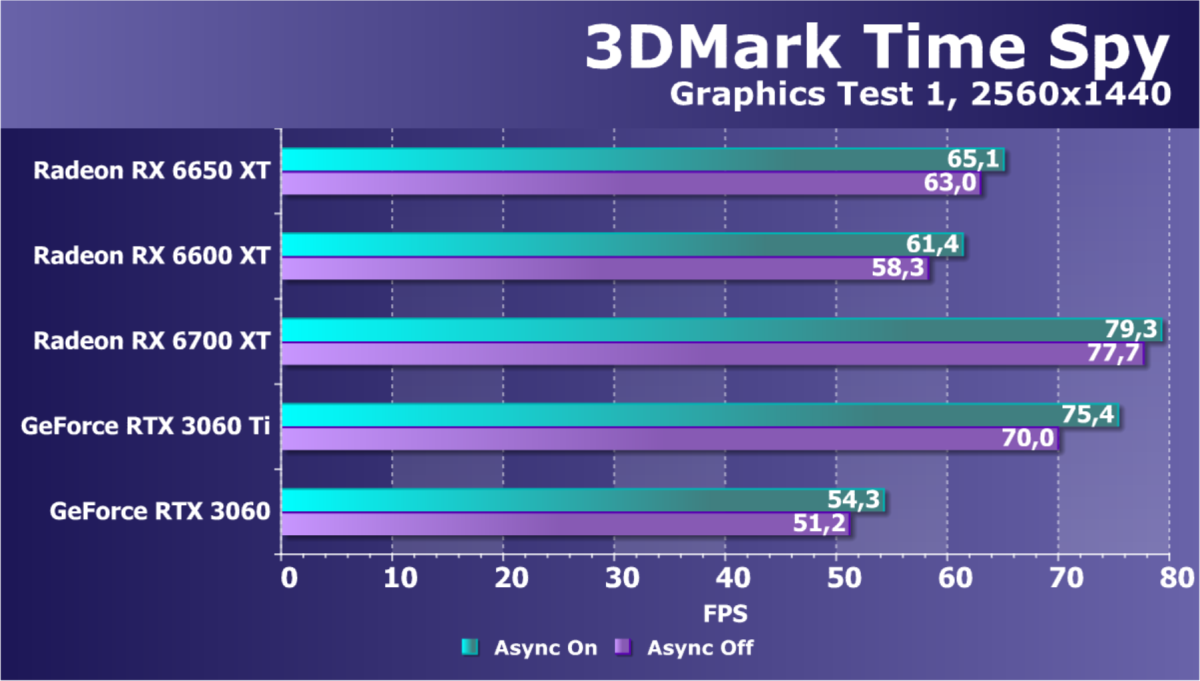 В играх Radeon RX 6650 XT где-то на 5%-7% быстрее в сравнении с обычной Radeon RX 6600 XT. Зато преимущество новинки над конкурирующей GeForce RTX 3060 выросло, хотя она все так же остается в среднем чуть медленнее модели GeForce RTX 3060 Ti. Возможно, вариант Radeon RX 6650 XT просто не требовал отдельного наименования. Да, он чуть быстрее, но и стоит на столько же больше, так что вряд ли усилит позиции компании на рынке. Фабрично разогнанных вариантов Radeon RX 6600 XT вполне хватило бы, чтобы добиться аналогичного уровня производительности.