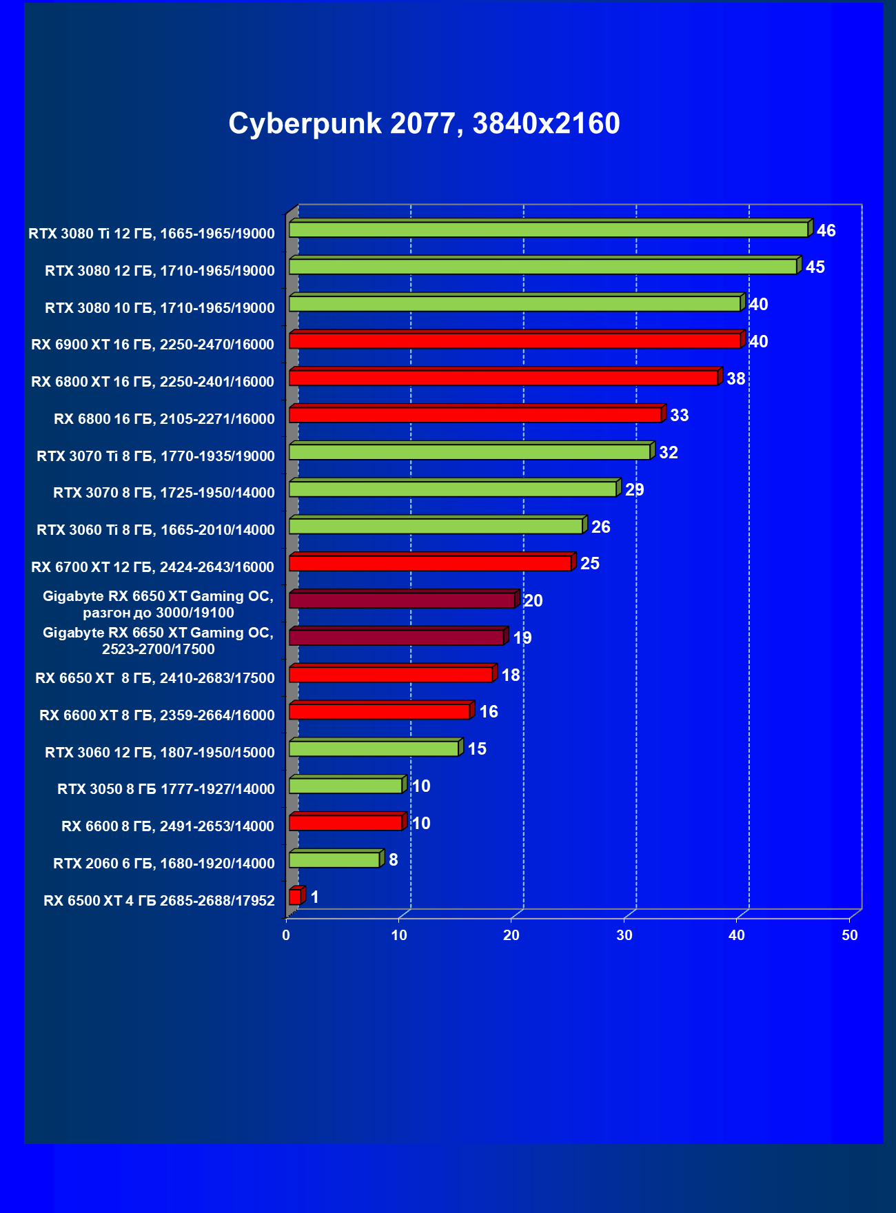 | 13 | RX 6650 XT 8 ГБ, 2523—2683/17500 | 230 | 46 | 50 000 |