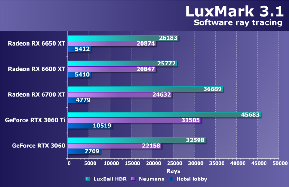 С соперниками от Nvidia все тоже очень просто. Прямым ценовым соперником новинки является GeForce RTX 3060 Ti, но мы взяли еще и младшую RTX 3060 — в некоторых тестах новое решение Radeon может быть ближе именно к ней, а не к старшей модели, особенно в тестах трассировки лучей. RTX 3070 же брать в тесты не было смысла, эта видеокарта Nvidia намного мощнее.