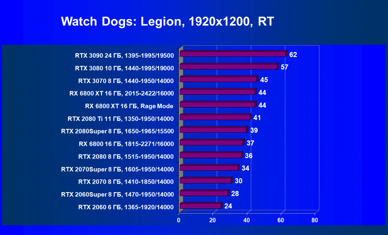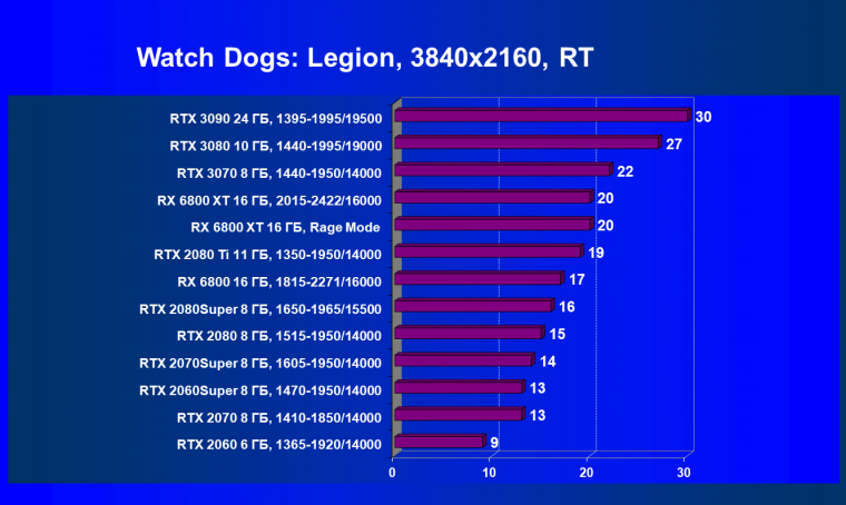 Как и в случае Radeon RX 6800 XT, тут все печально. Наблюдается проигрыш не только своему прямому конкуренту GeForce RTX 3070, но и ускорителю 2-летней давности GeForce RTX 2080. Также надо напомнить, что в ряде игр со включенной трассировкой лучей при использовании видеокарты AMD наблюдаются артефакты, например некорректная отрисовка отражений в Watch Dogs: Legion.