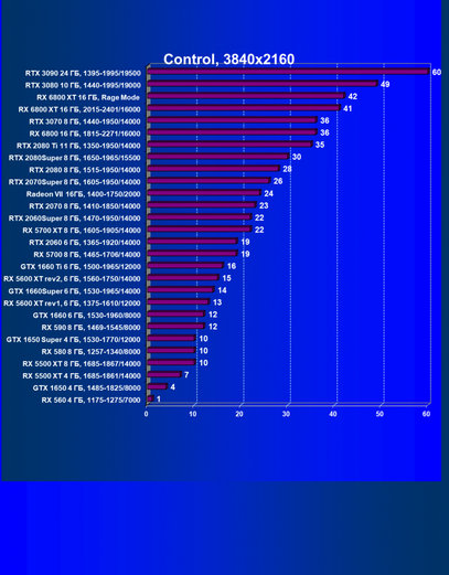 Radeon RX 6800 обгоняет прежние самые быстрые карты AMD (Radeon VII и Radeon RX 5700 XT) и тоже позволяет играть в 4К, обеспечивая в этом разрешении приемлемую производительность при высоких настройках графики, но опять же при условии, что игрок не будет включать трассировку лучей! Увы, у AMD пока нет полного аналога для «умного» метода сглаживания Nvidia DLSS, который смог бы без потерь в качестве картинки нивелировать падение производительности от включения RT.