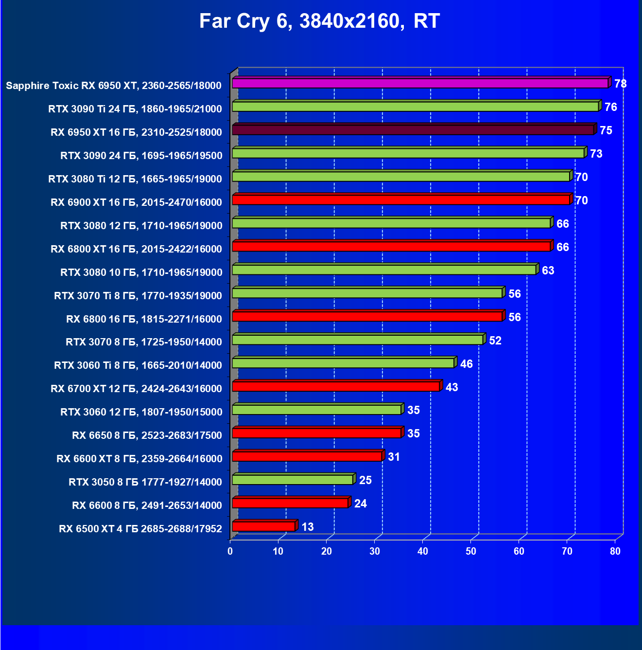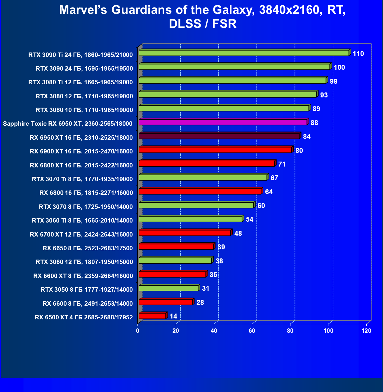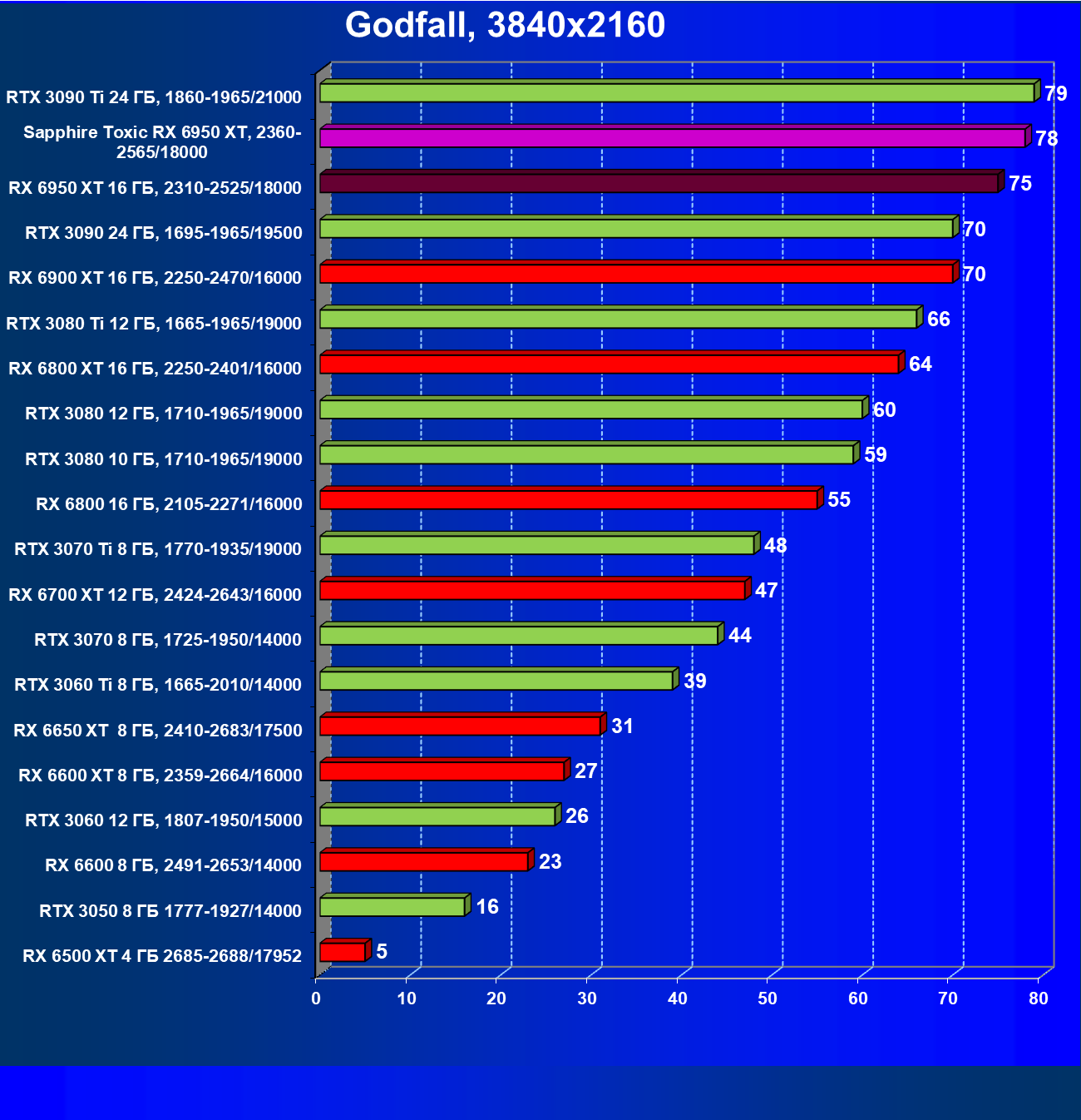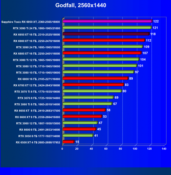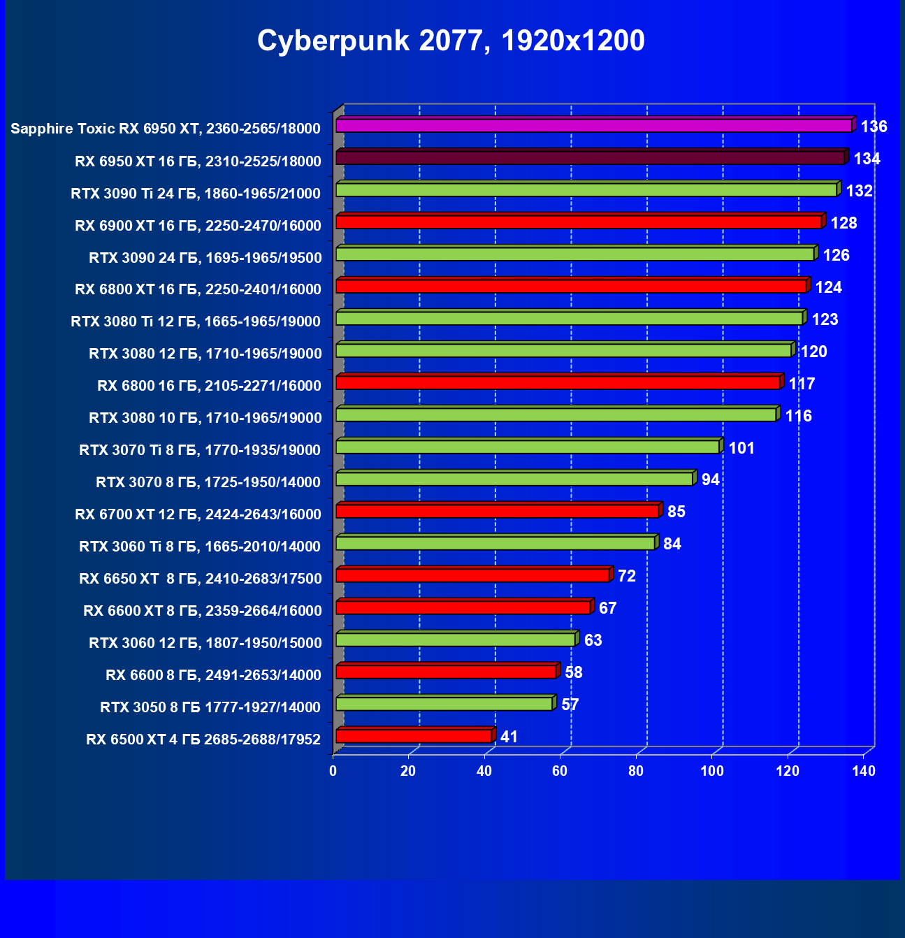 | 17 | Sapphire Toxic RX 6950 XT, 2360—2565/18000 | 79 | 904 | 114 000 |