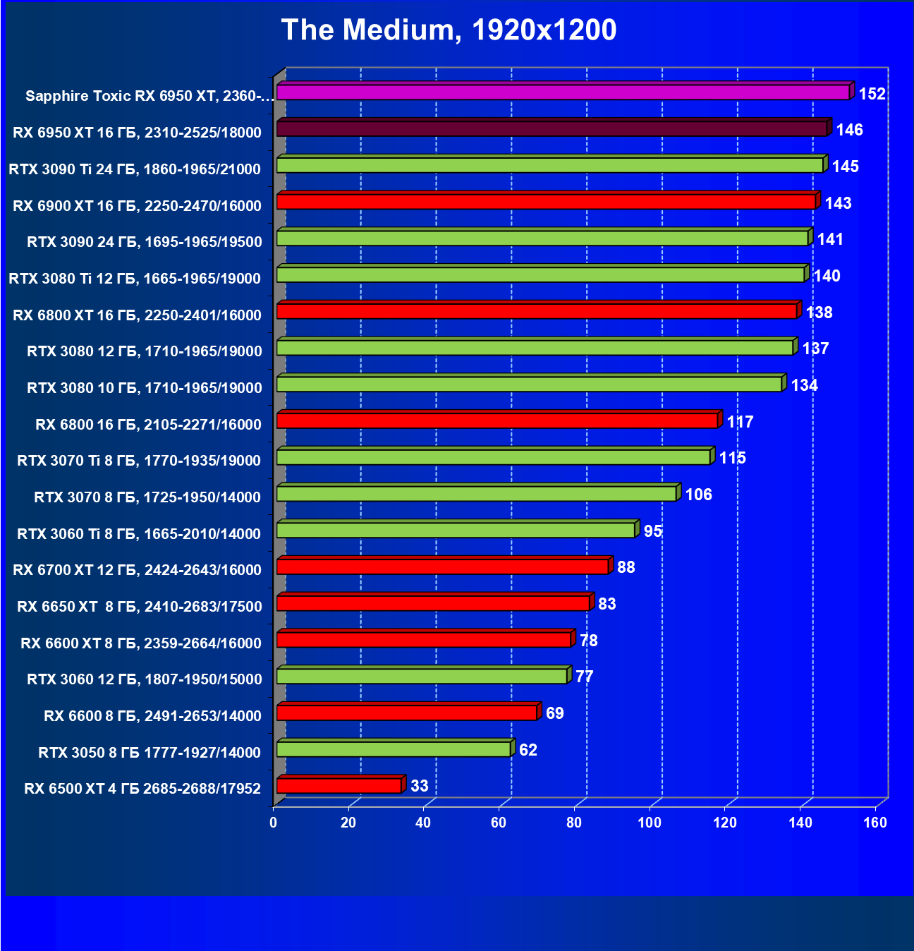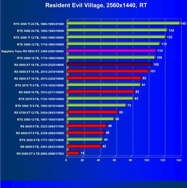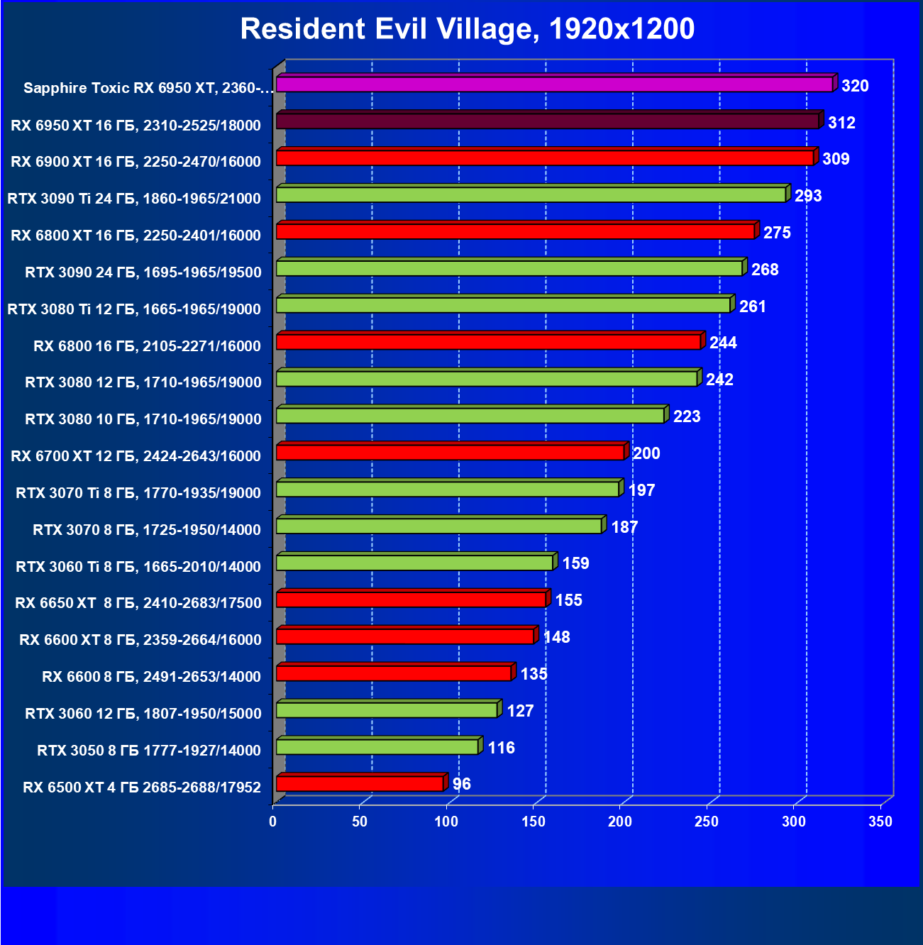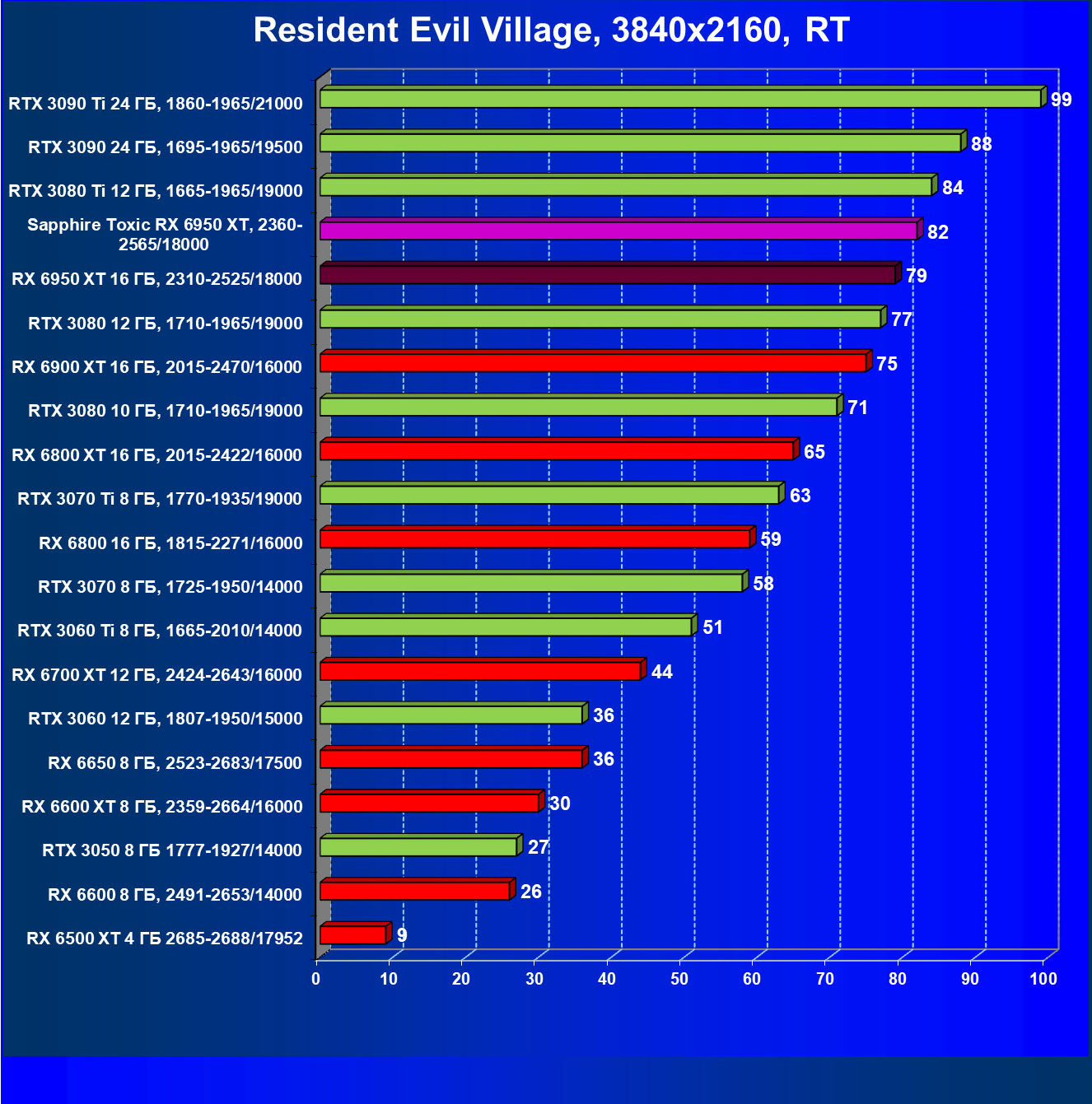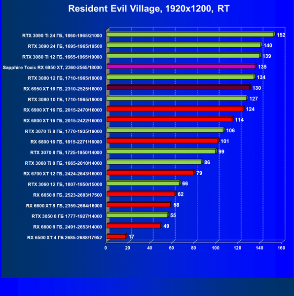Прекрасно видно, что RX 6950 XT идет практически на уровне RTX 3090 Ti, отстает совсем чуть-чуть. То есть это действительно конкуренты в классических играх. Карта Sapphire и вовсе обошла RTX 3090 Ti за счет более высоких частот работы.