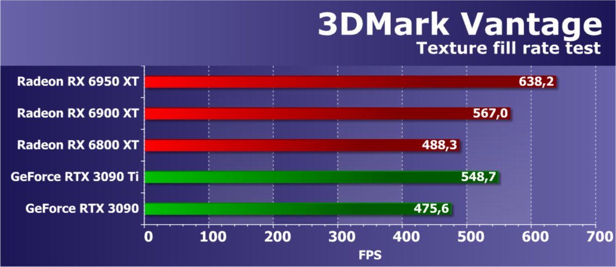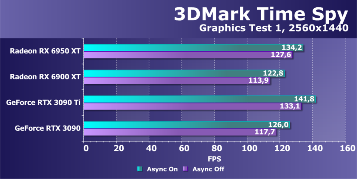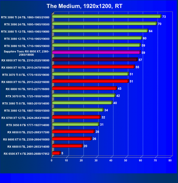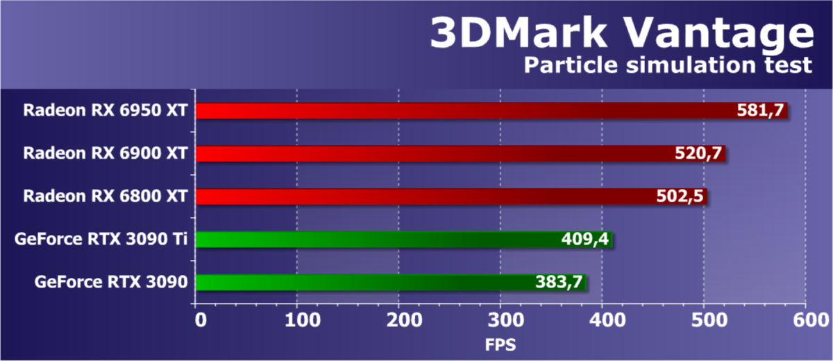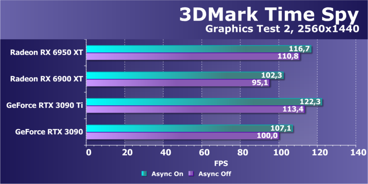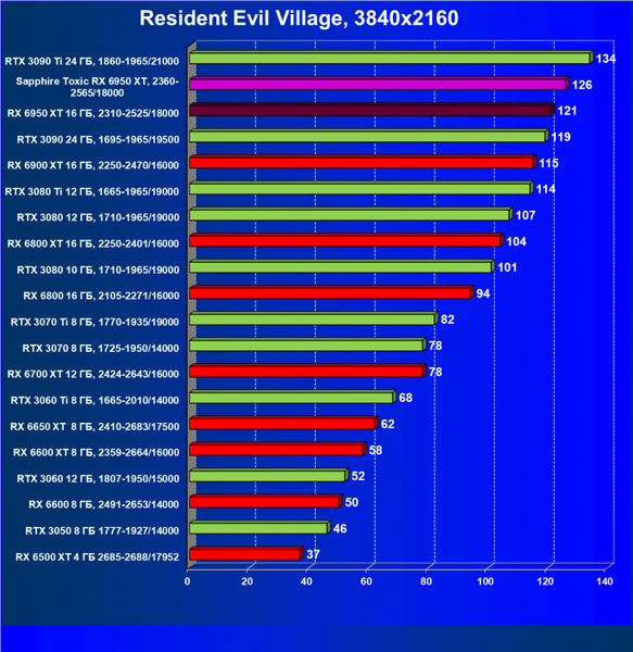 Прекрасно видно, что RX 6950 XT идет практически на уровне RTX 3090 Ti, отстает совсем чуть-чуть. То есть это действительно конкуренты в классических играх. Карта Sapphire и вовсе обошла RTX 3090 Ti за счет более высоких частот работы.