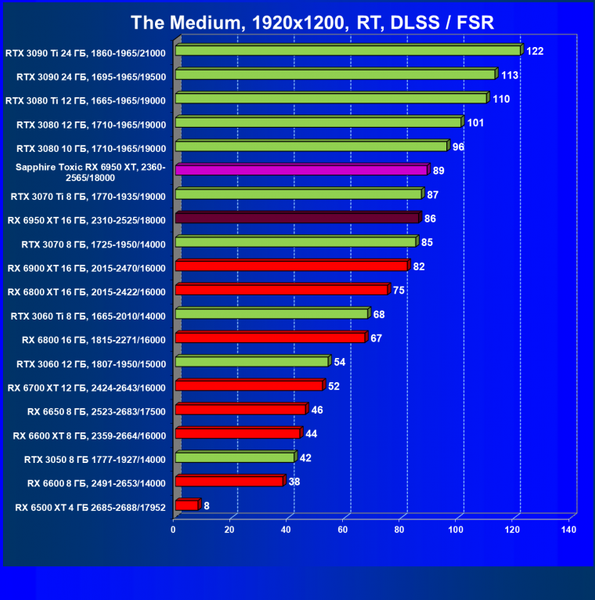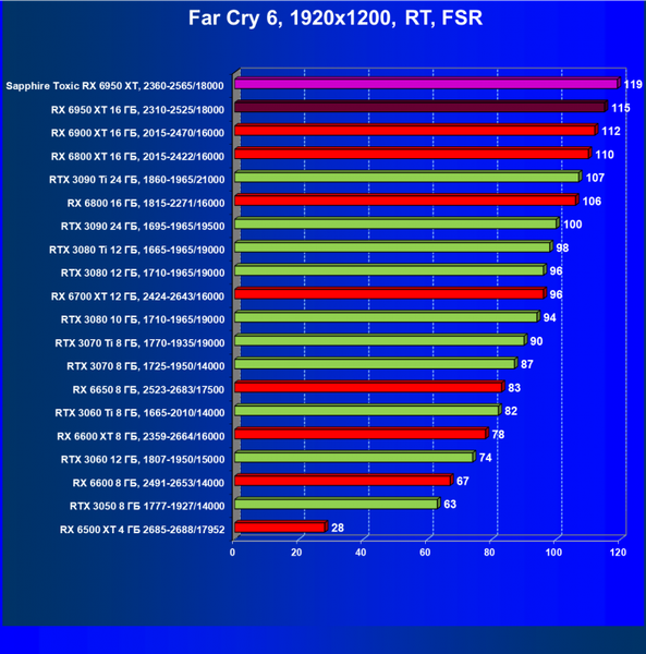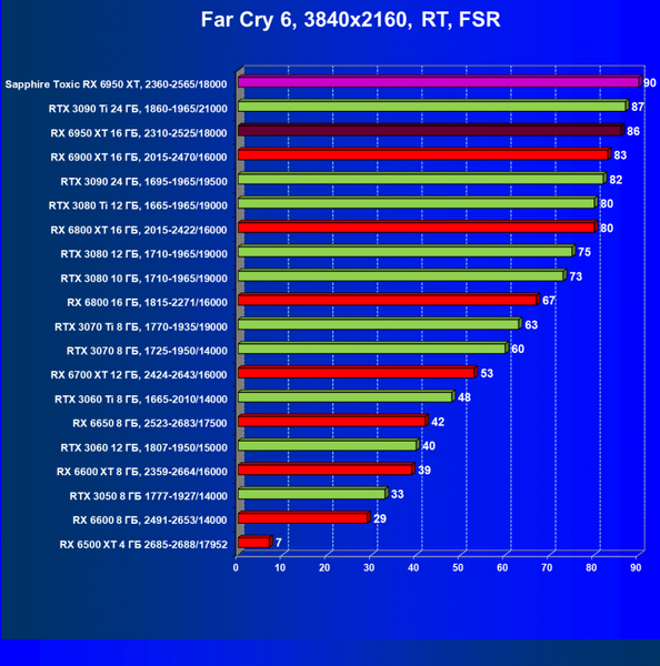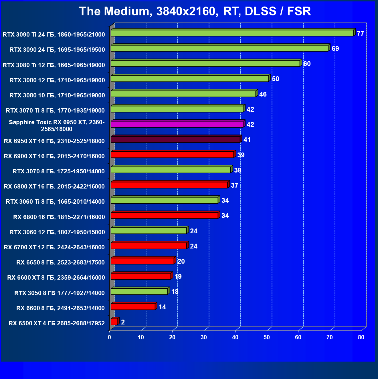 В целом AMD Radeon RX 6950 XT (как и его предшественник Radeon RX 6900 XT) продемонстрировал свою принадлежность к числу ускорителей флагманского уровня, конкурируя с GeForce RTX 3090/3090 Ti в классических играх с растеризацией. В играх с трассировкой лучей без поддержки FSR новый Radeon RX 6950 XT демонстрирует производительность лишь на уровне GeForce RTX 3070 Ti, однако сейчас уже много игр имеют поддержку AMD FSR, что позволяет в значительной мере компенсировать потери от включения RT. Поэтому в целом даже в играх с трассировкой лучей новый ускоритель соответствует уровню между GeForce RTX 3080 12 ГБ и GeForce RTX 3080 Ti. Основным отличием Radeon RX 6950 XT от Radeon RX 6900 XT является использование более быстрой памяти, а также незначительно повышенная частота работы ядра.