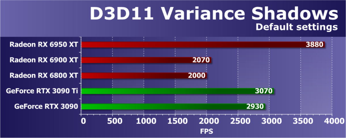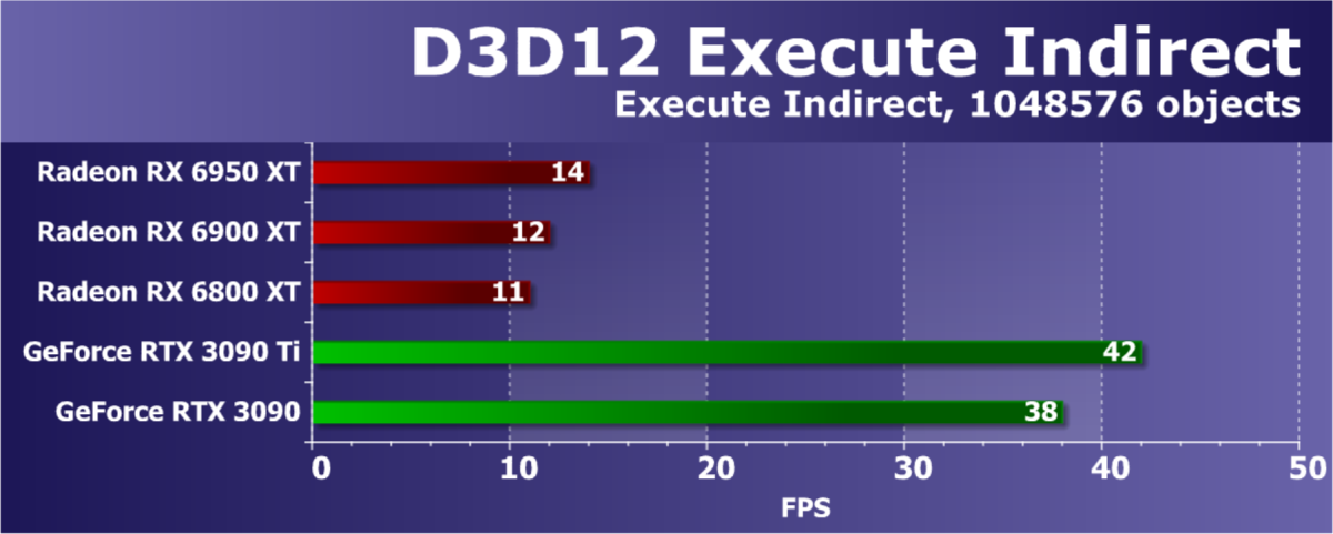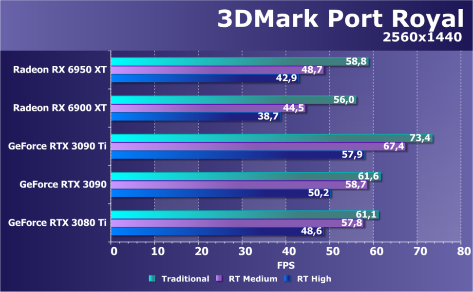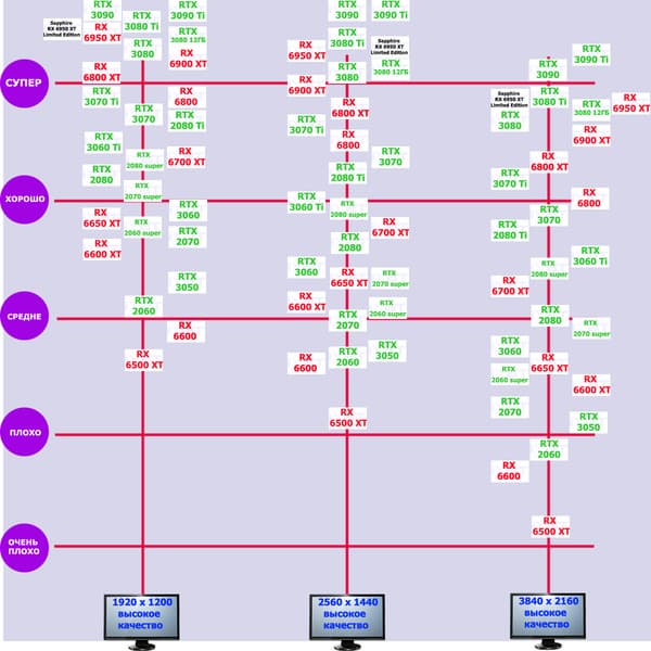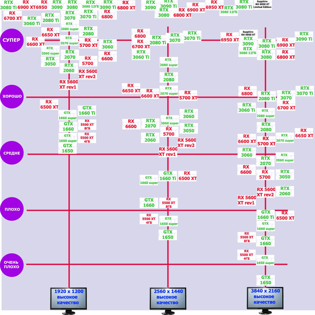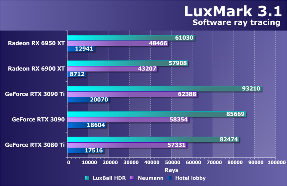 Хотя GeForce RTX 3090 Ti и быстрее новинки, она продается чуть ли не вдвое дороже. Зато RX 6950 XT в среднем быстрее RTX 3080 Ti, которая также стоит чуть дороже. Вообще, RTX 3090 и RTX 3090 Ti уж слишком дороги, чтобы оправдать их покупку — разница в производительности не настолько велика. Но производительность в играх очень сильно зависит от конкретных приложений, и если в игре есть трассировка лучей, то все решения Nvidia ожидаемо будут быстрее аналогов AMD по цене, хотя и производительности RX 6950 XT хватает в подавляющем большинстве случаев, если не брать крайности. В «оптимизированных» же под AMD играх трассировки обычно не так много, чтобы выполнение соответствующих расчетов сильно сказывалось на итоговой производительности.