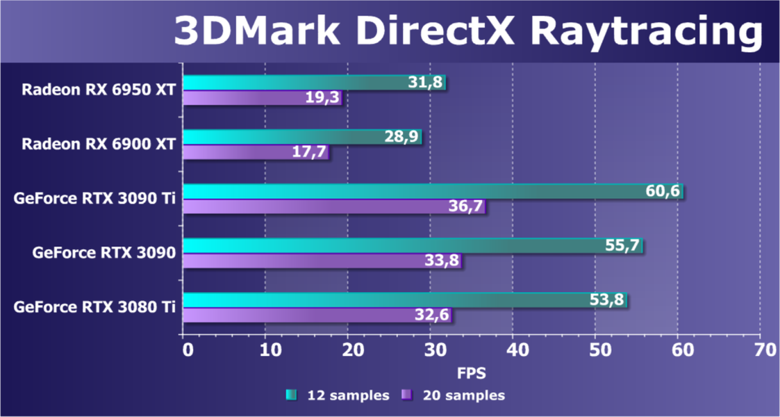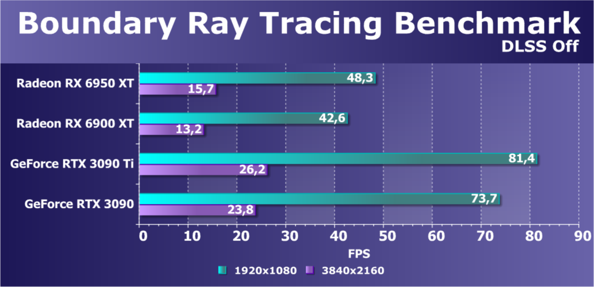 Здесь можно только повторить тезис о слабом месте семейства Radeon RX 6000, поскольку в архитектуре Navi не заложено наличие отдельных блоков для обсчета RT. И, как мы уже ранее говорили, лишь поддержка AMD FSR в новых играх позволяет RX 6950 XT не скатиться ниже уровня RTX 3070, оставшись между RTX 3080 Ti и RTX 3080. В итоге мы все-таки можем условно причислить RX 6950 XT к ускорителям, обеспечивающим приемлемую «играбельность» в разрешении 4К при включении трассировки лучей (разумеется, только совместно с FSR).