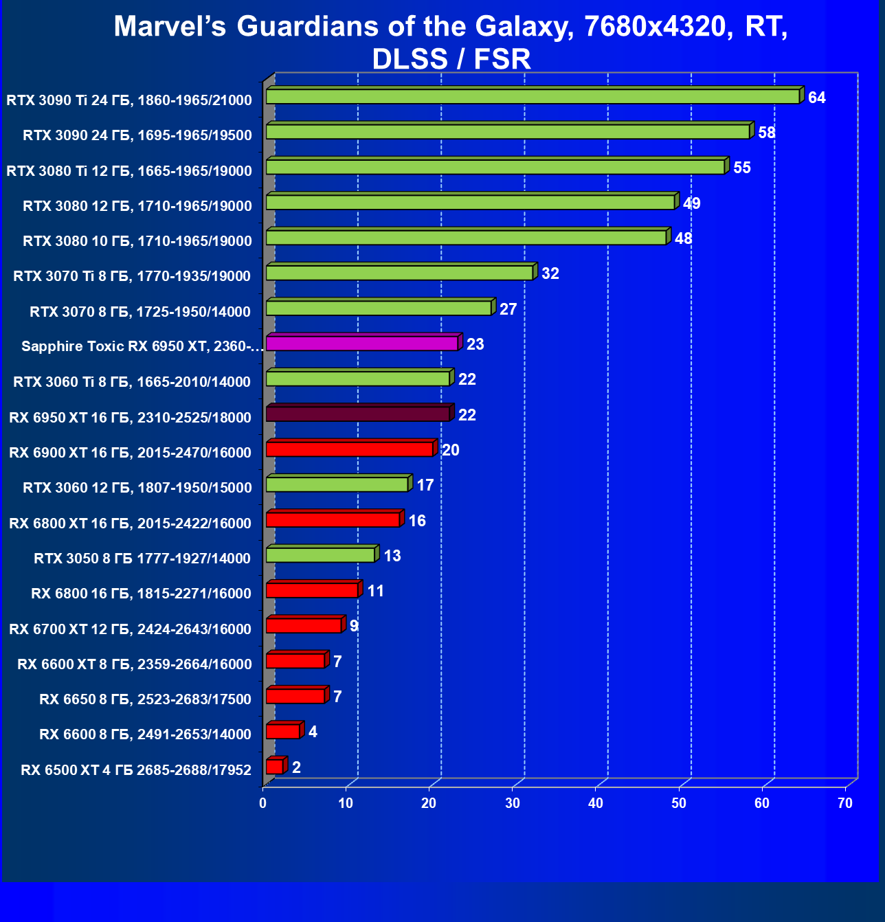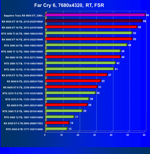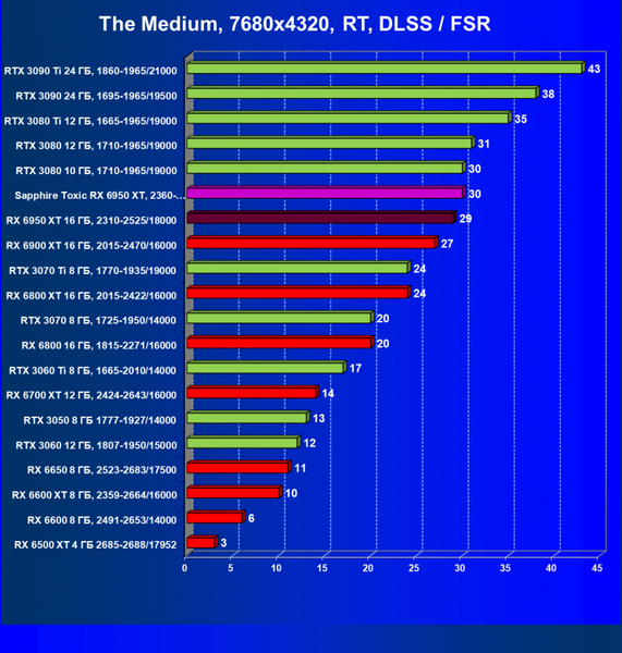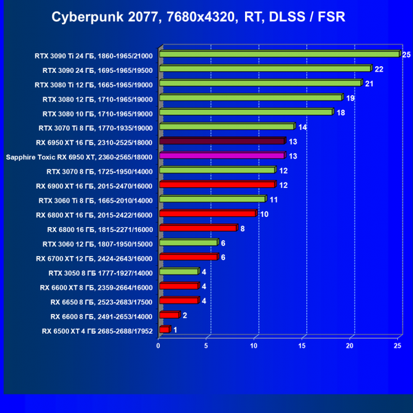 RX 6950 XT является конкурентом сегодняшнему лидеру по производительности — RTX 3090 Ti. И поскольку его мы ранее тестировали в разрешении 8К, то логично было протестировать в этом огромном разрешении и новинку — разумеется, с применением FSR и трассировки лучей.