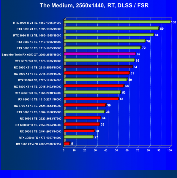 Рейтинг составлен по 9 тестам, в которых используется технология трассировки лучей и одновременно технология Nvidia DLSS или AMD FSR. Этот рейтинг нормирован по самому слабому ускорителю в данной группе — Radeon RX 6500 XT (то есть сочетание скорости и функций Radeon RX 6500 XT приняты за 100%).