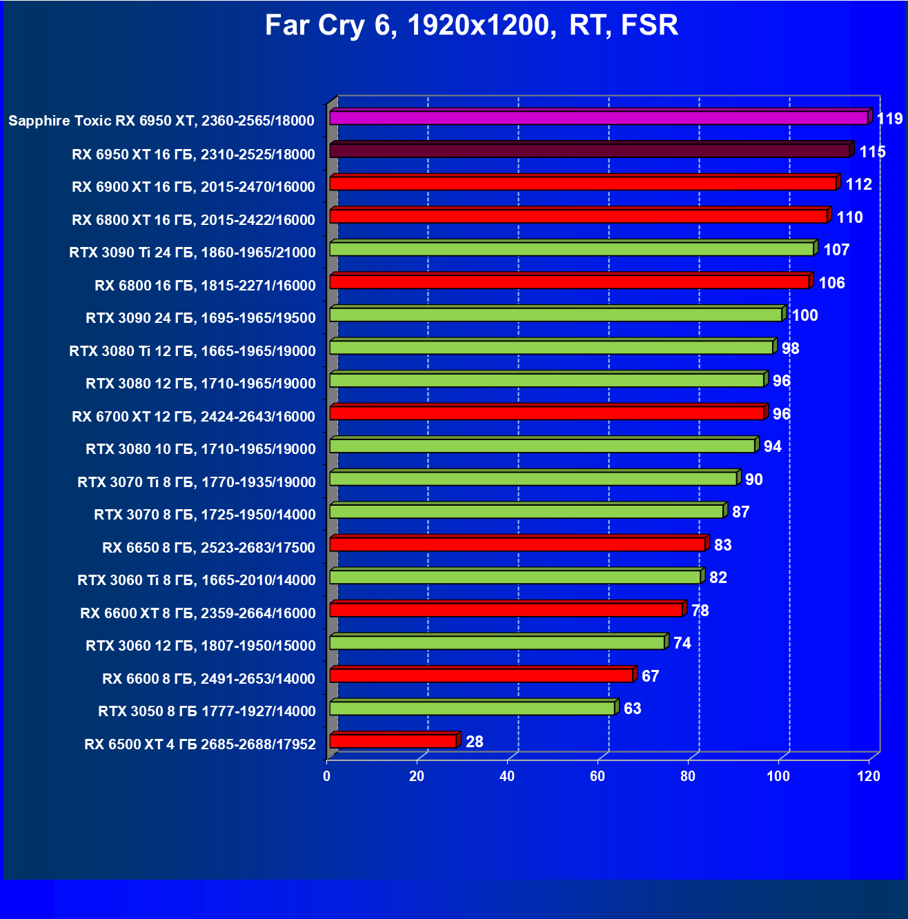 Radeon RX 6950 XT позволит комфортно играть в разрешении 4K при максимальных настройках графики, причем как в играх без трассировки лучей, так и с оной, но с одновременной поддержкой AMD FSR (и всё равно в ряде игр придется снижать либо настройки графики, либо разрешение). Если же говорить об играх с RT без поддержки FSR, то приемлемый комфорт мы сможем получить только в разрешении уровня 1440р.