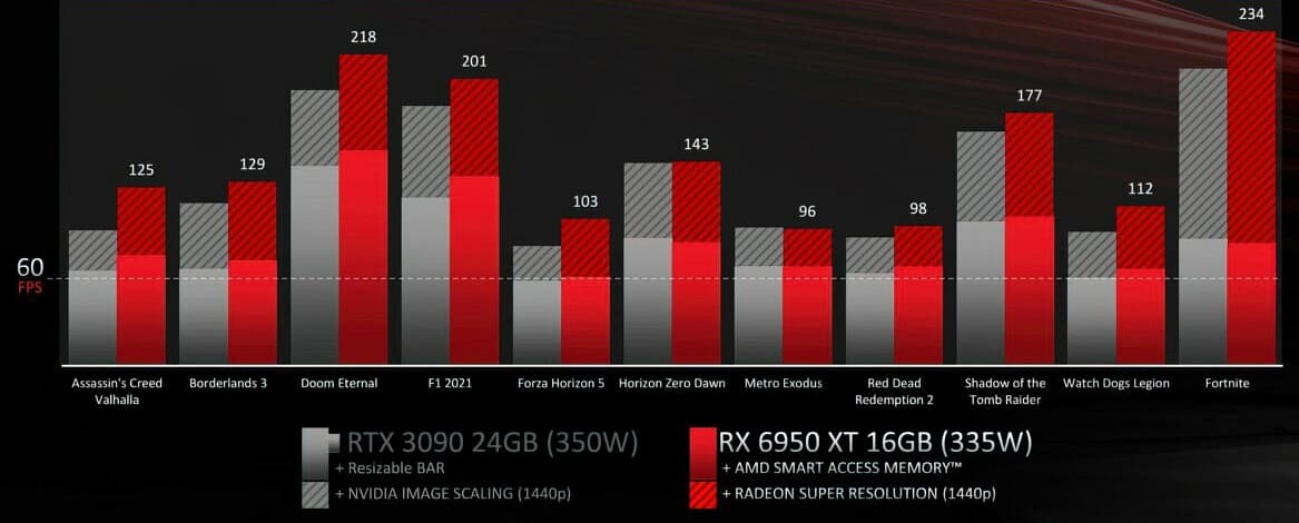 Radeon RX 6900 XT — это прямой конкурент GeForce RTX 3090, а RX 6950 XT — конкурент RTX 3090 Ti, если мы говорим о классических играх без RT. С такой картой можно очень прилично (и даже комфортно) играть в разрешении 4К при условии максимальных настроек графики. Понятное дело, что в меньших разрешениях тоже будет отменный геймплей. В некоторые игры при тех же условиях можно будет поиграть и в разрешении 8К, но для них обязательно надо включать AMD FSR (AMD Fidelity Super Resolution). Если игра эту технологию не поддерживает, то про 8К лучше не думать.