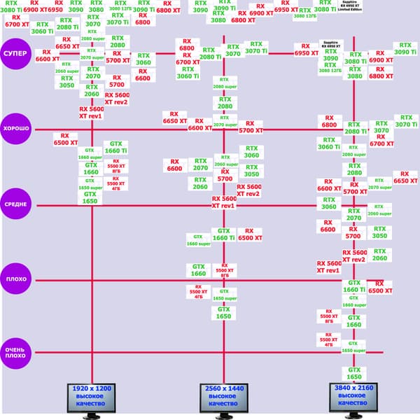 | 14 | RX 6900 XT 16 ГБ, 2250—2470/16000 | 86 | 822 | 95 000 |