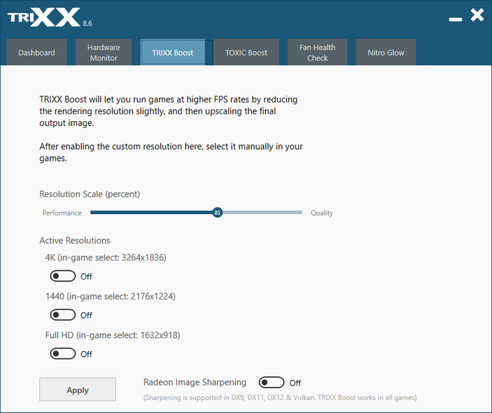 Как всегда, когда в аппаратной части особых изменений нет, можно поговорить о весьма важной программной части. Компания AMD продолжает развивать свои драйверы и программные технологии, призванные выжать больше из аппаратных возможностей их видеокарт Radeon. Например, возьмем столь популярные сейчас алгоритмы повышения производительности за счет рендеринга в меньшем разрешении и последующего масштабирования в большее, которые позволяют повысить производительность при небольшом снижении качества картинки, почти незаметном в динамике при достаточно высоком разрешении вывода.