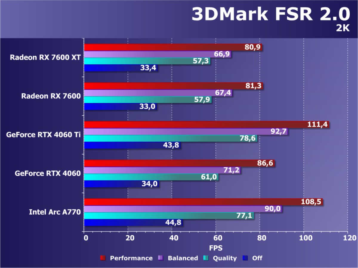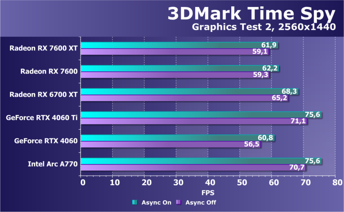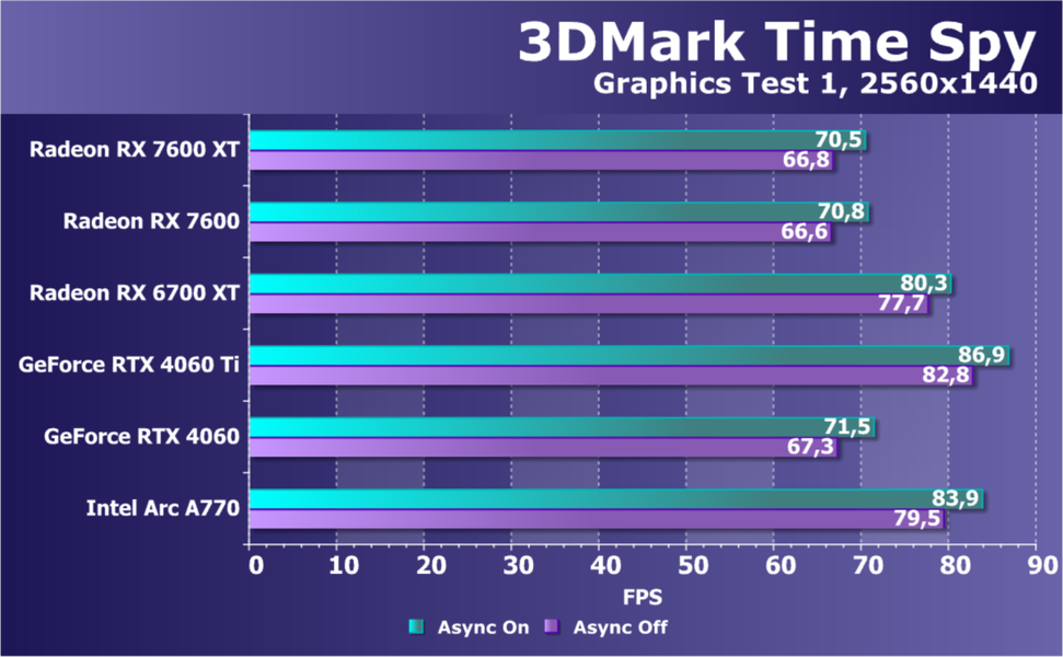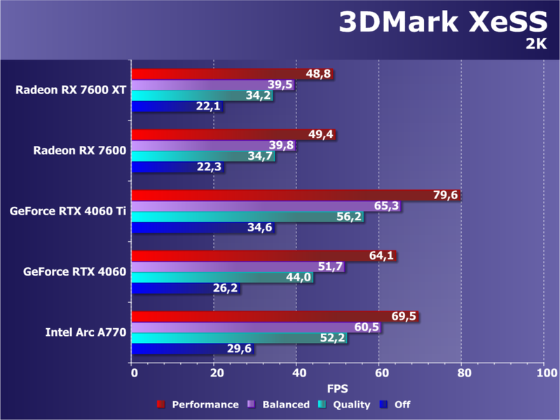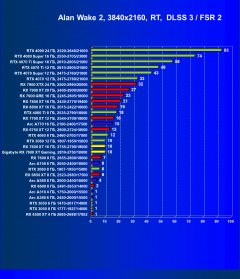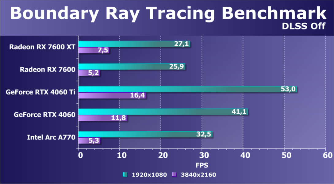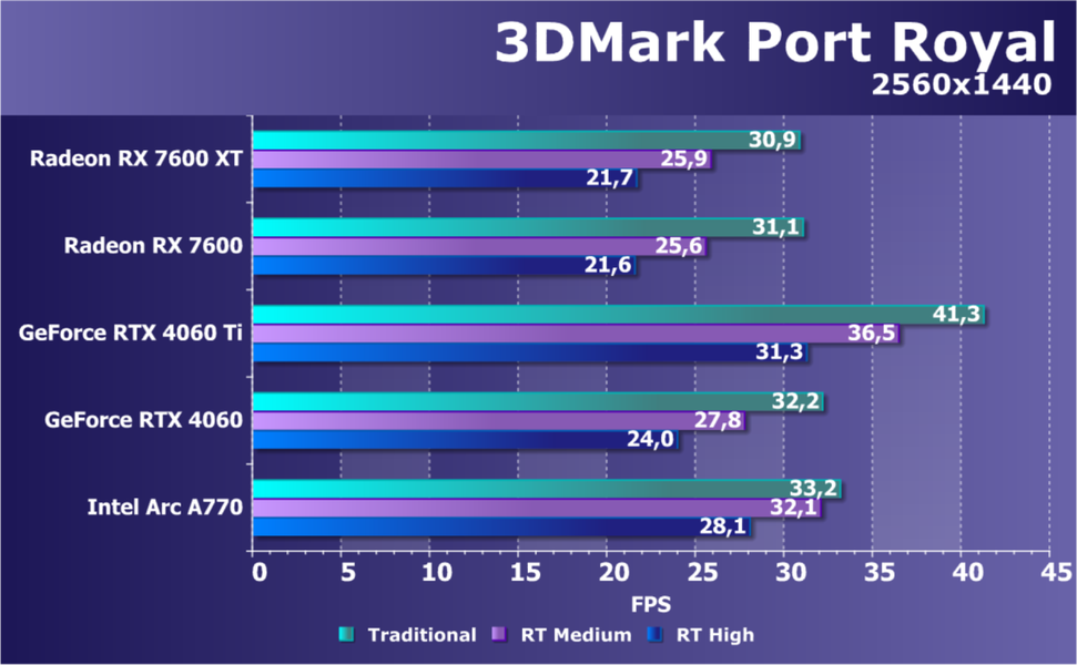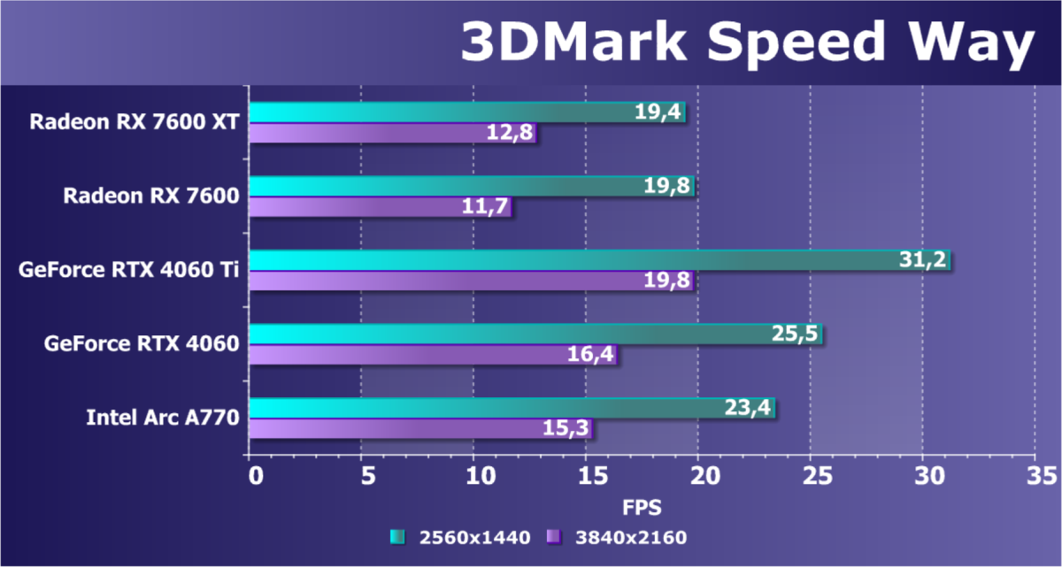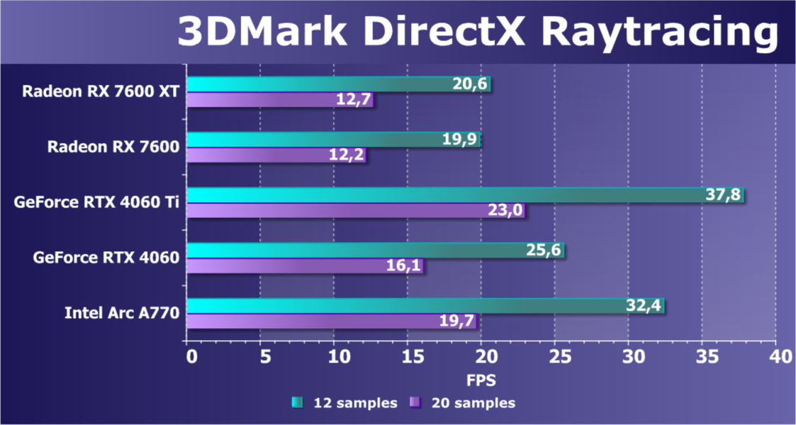 В играх с RT и DLSS/FSR/XeSS мы видим кардинально иную картину: Radeon RX 7600 XT проигрывает всем конкурентам, кроме Arc A750, однако последняя сильно дешевле. Увы, результаты удручают. Очевидно, что такой ускоритель должен быть заметно дешевле. Заметим, что перевес Radeon RX 7600 XT в сравнении с Radeon RX 7600 уже достигает уровня 17%, здесь может дополнительно играть роль разница в объеме локальной памяти, к которой чувствительны режимы с трассировкой лучей.