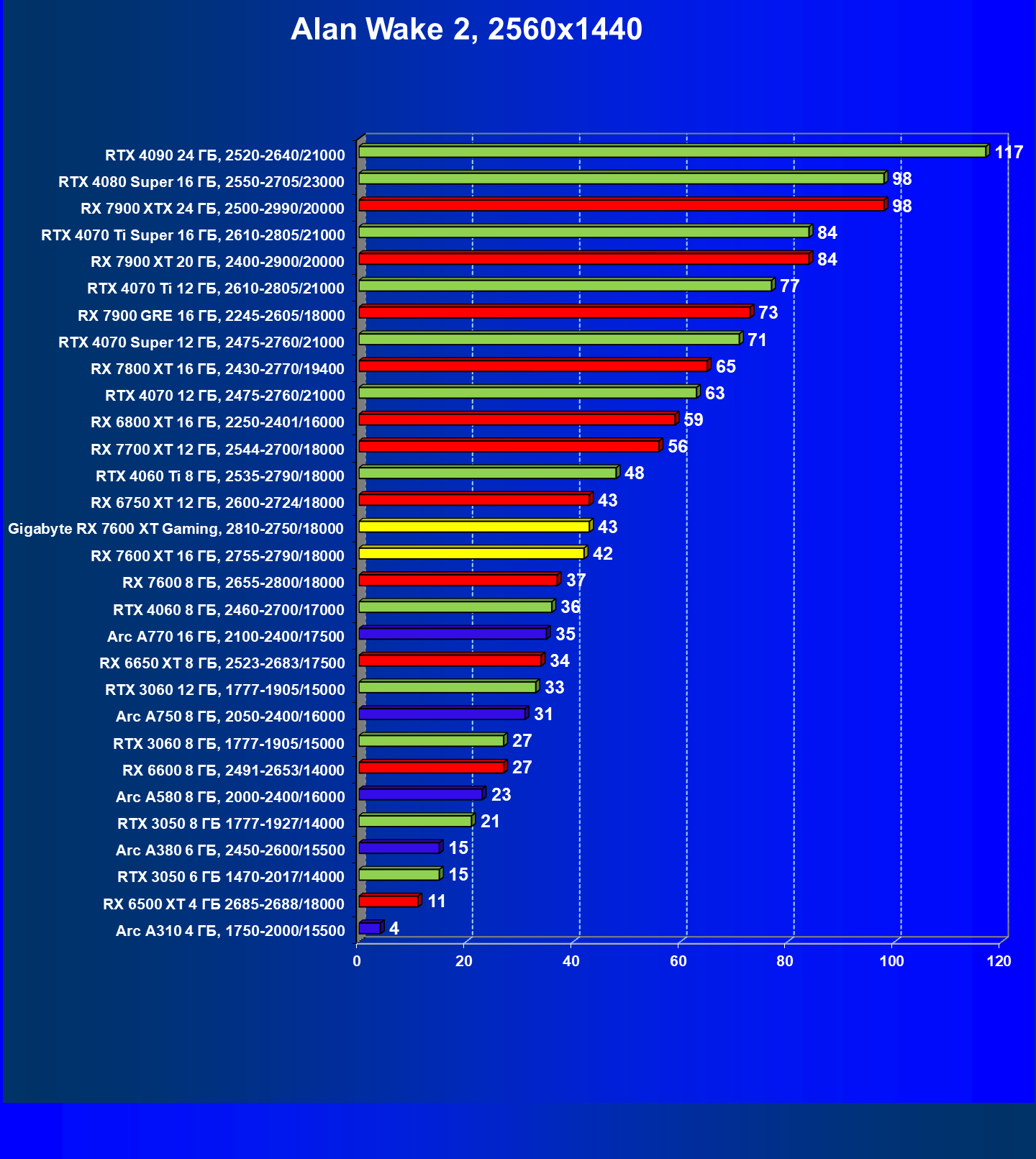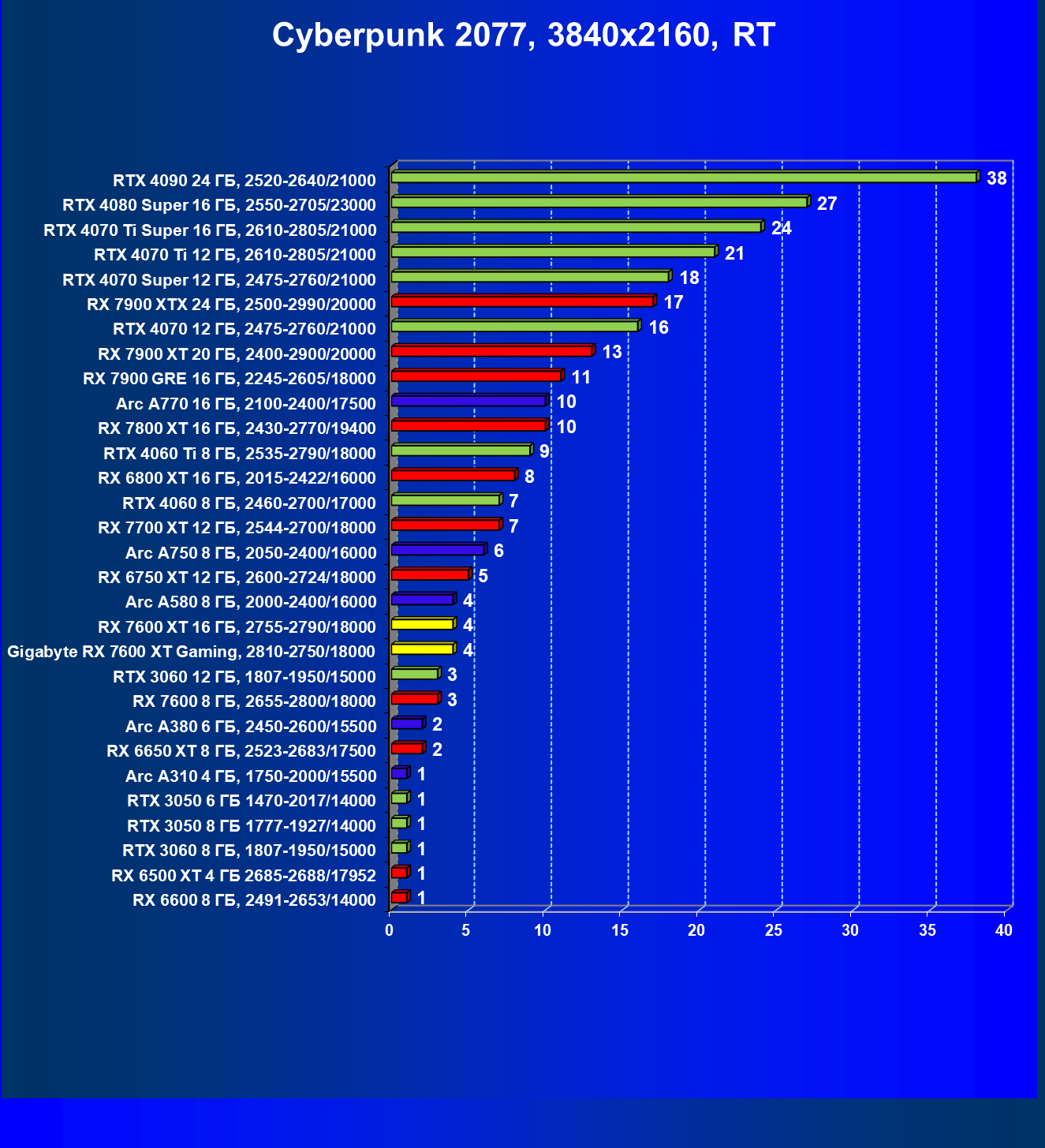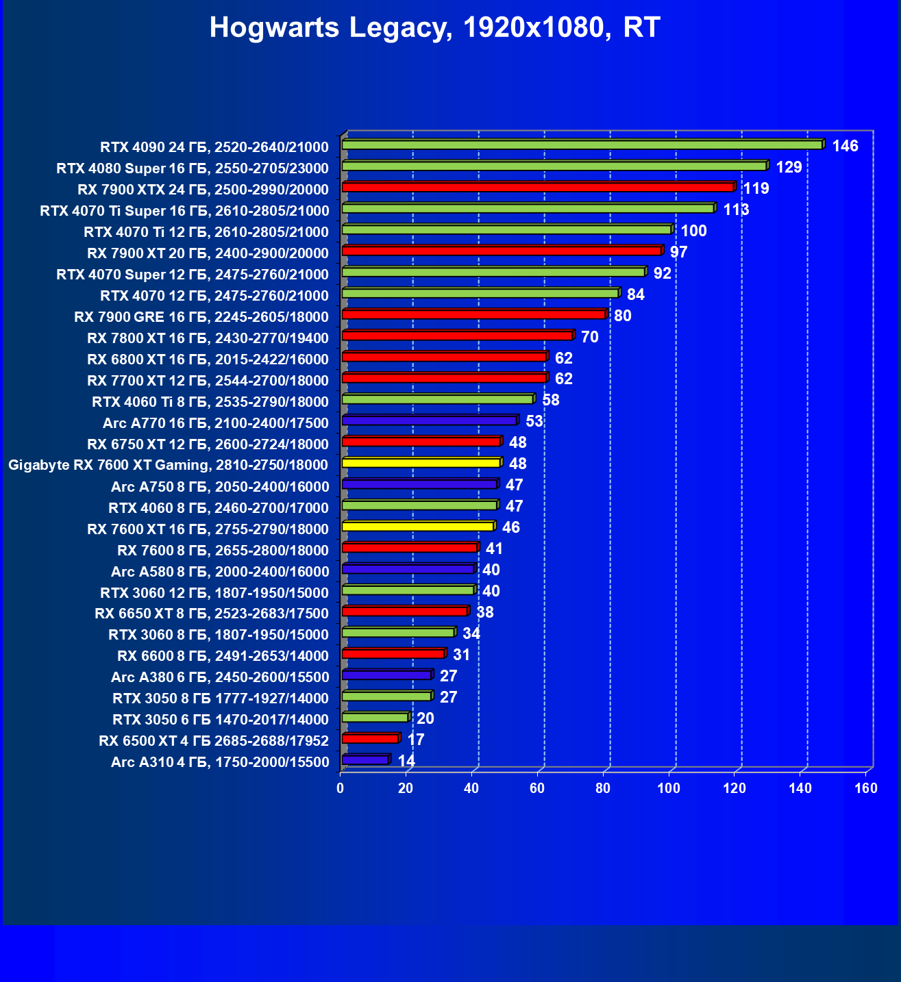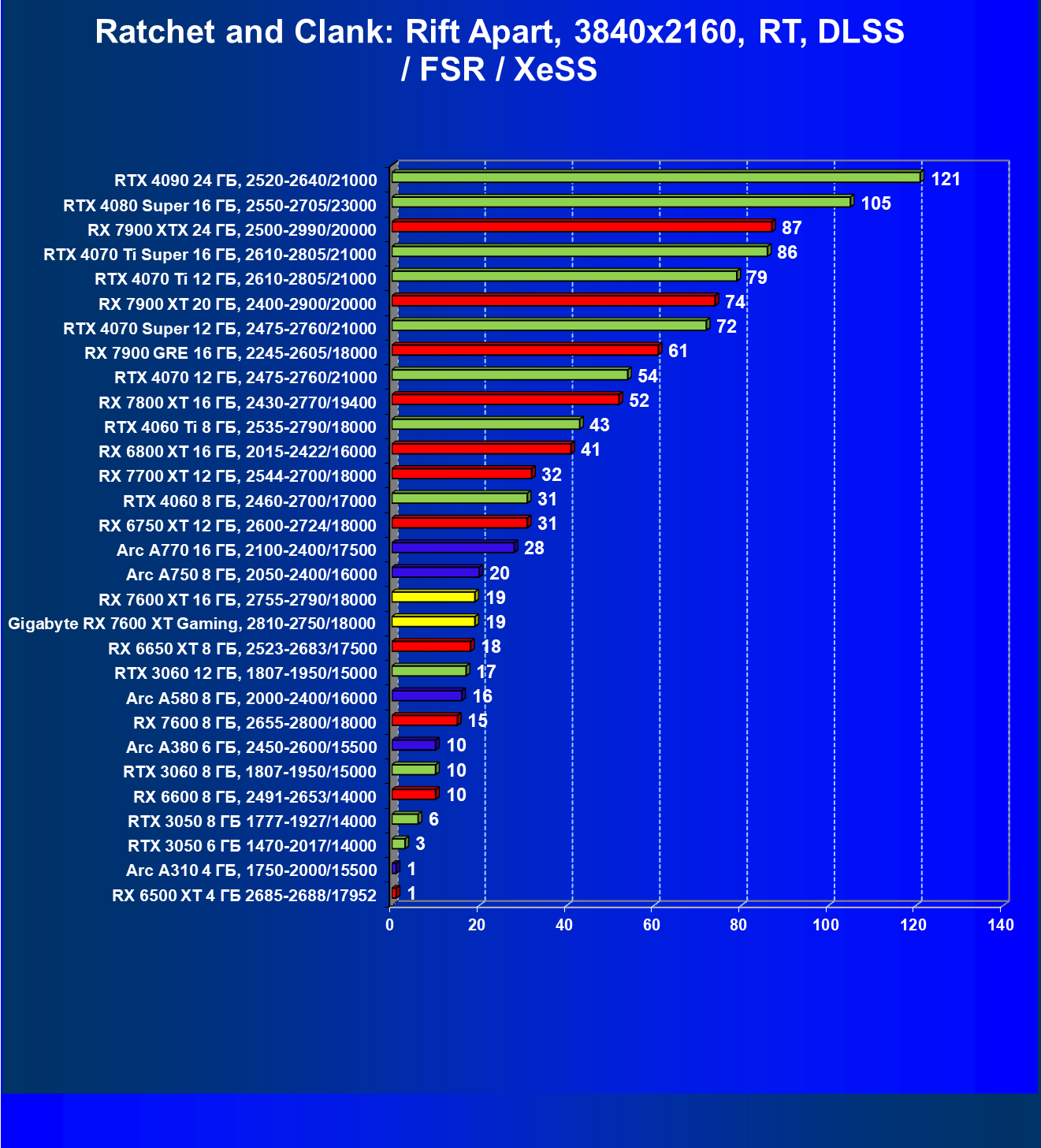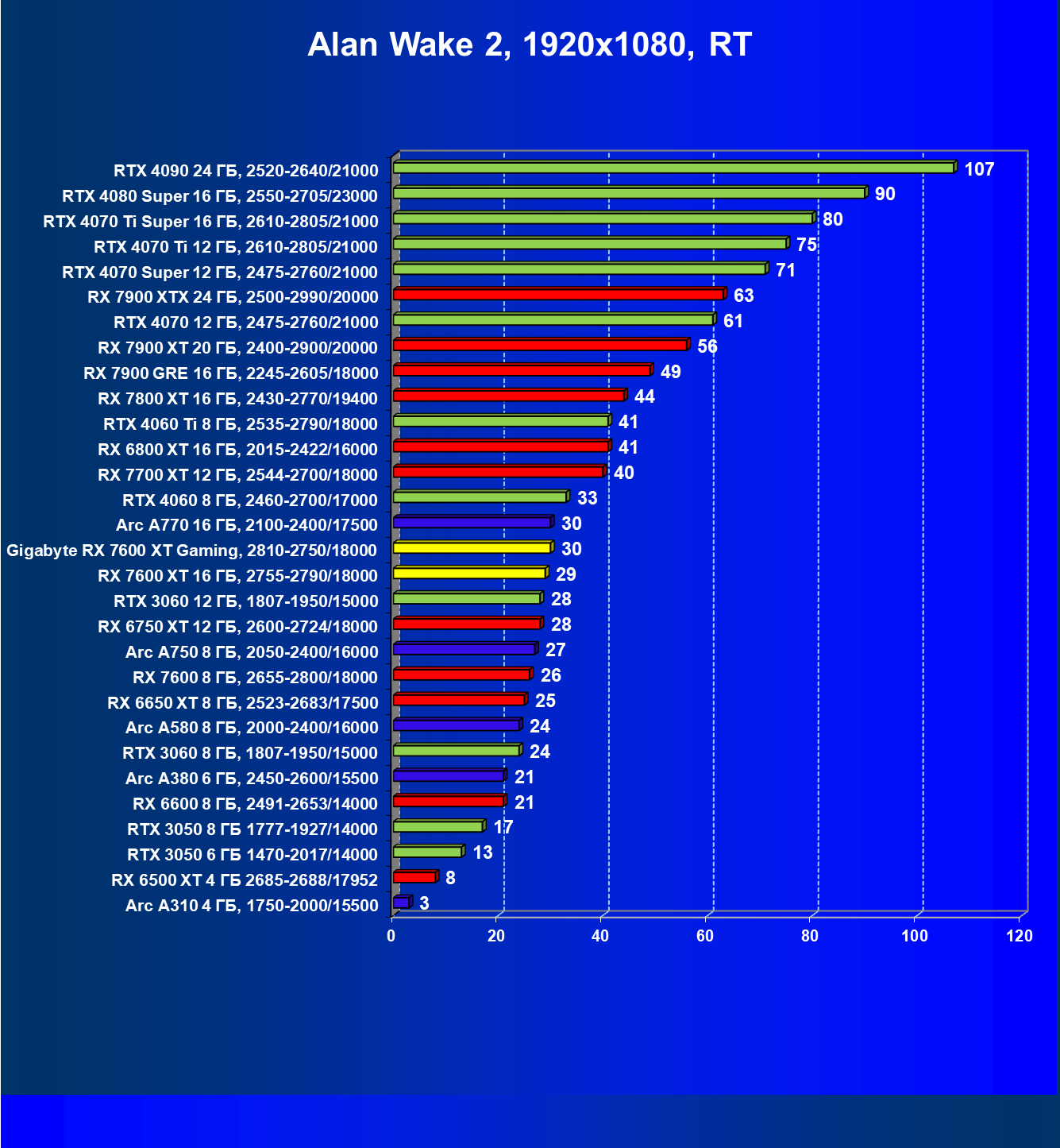 | 21 | RX 7600 XT 16 ГБ, 2755—2790/18000 | 124 | 535 | 43 000 |