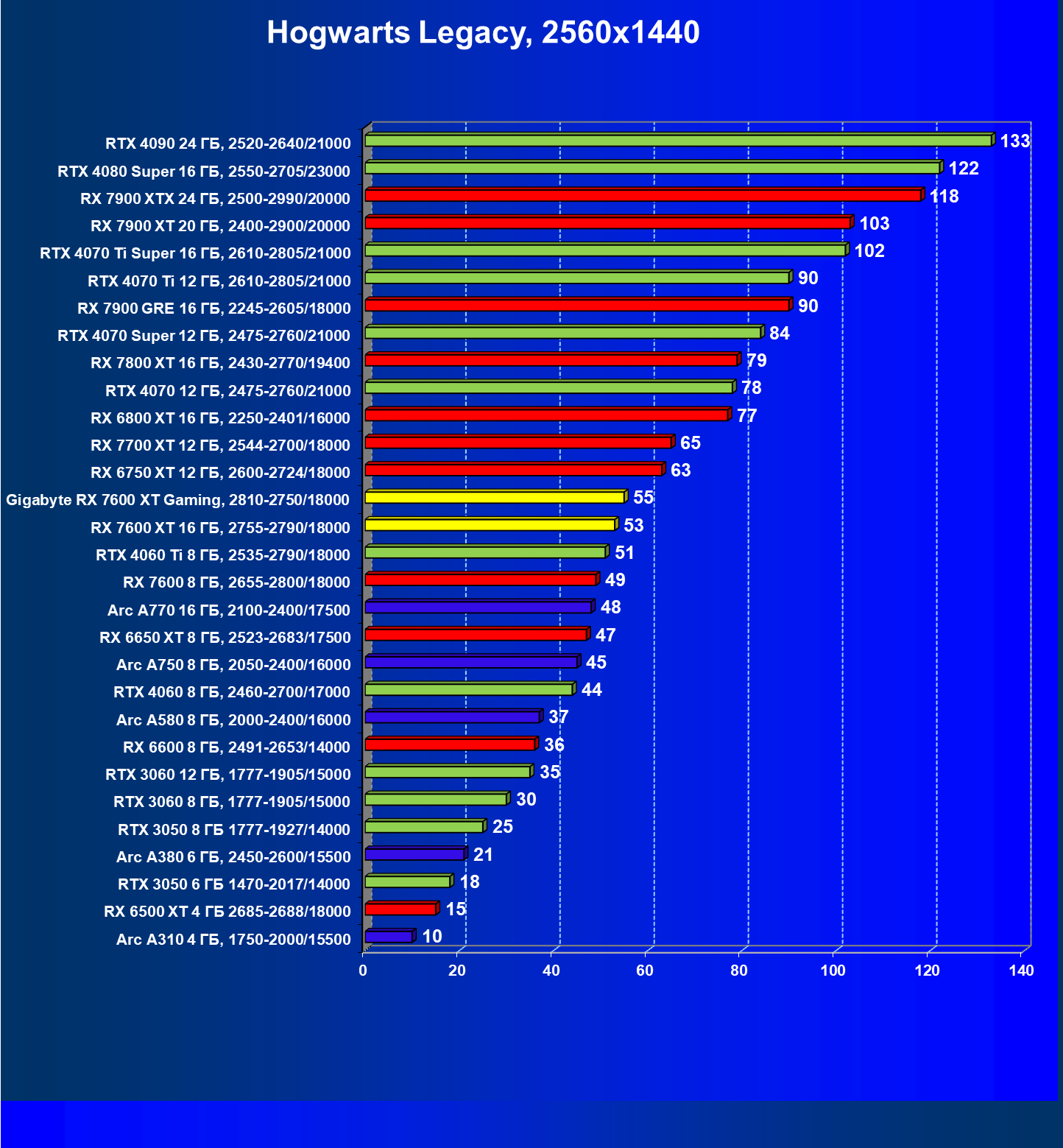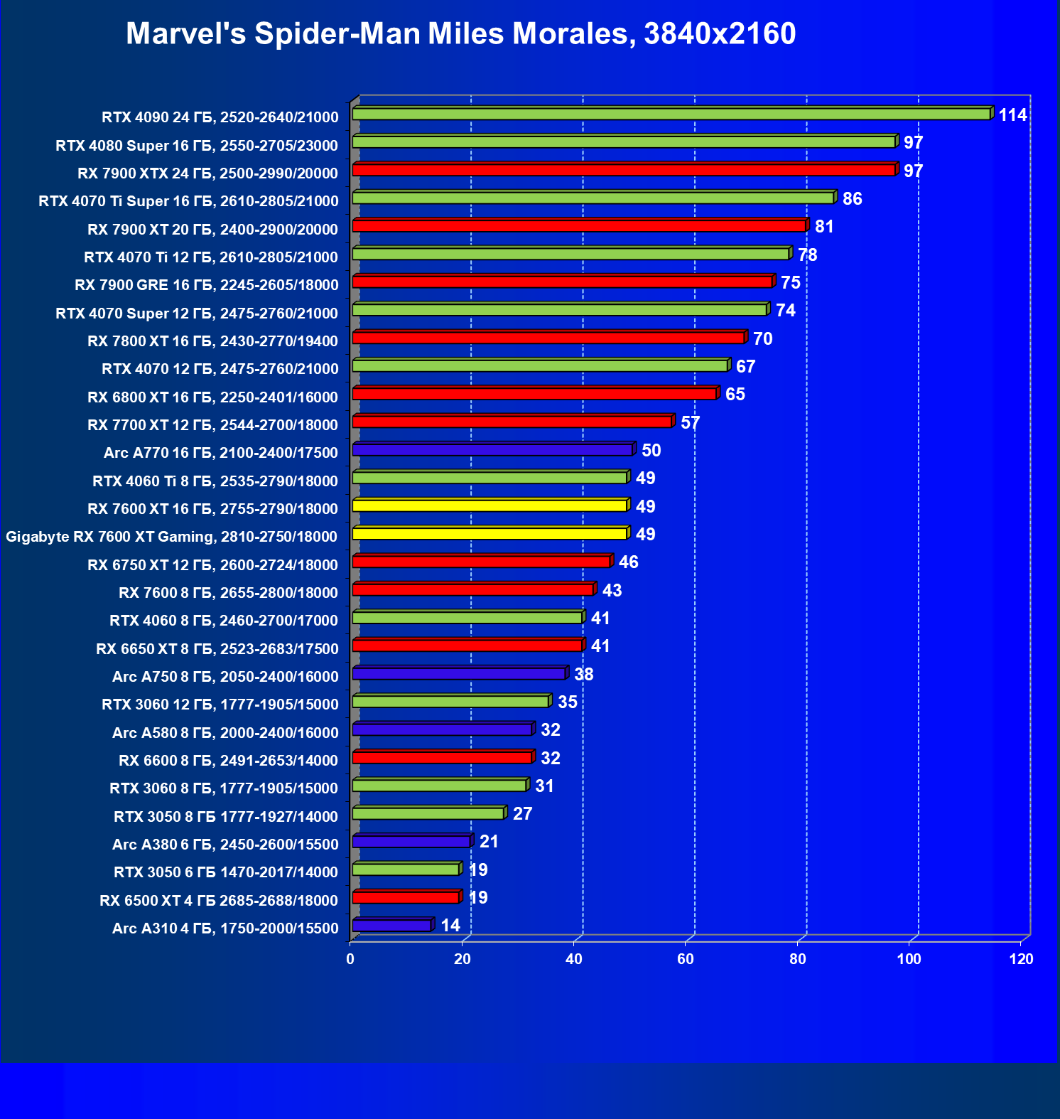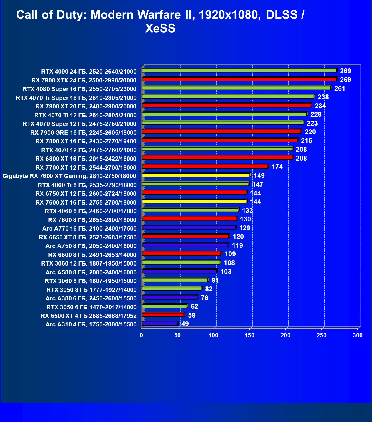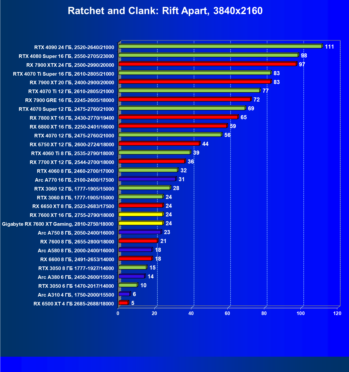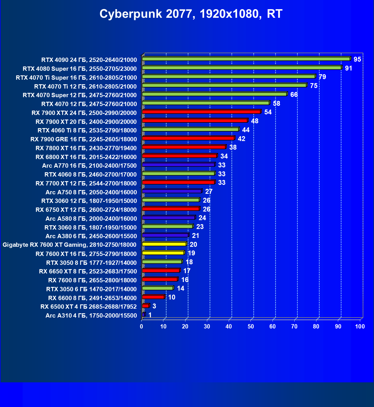 | 21 | RX 7600 XT 16 ГБ, 2755—2790/18000 | 124 | 535 | 43 000 |