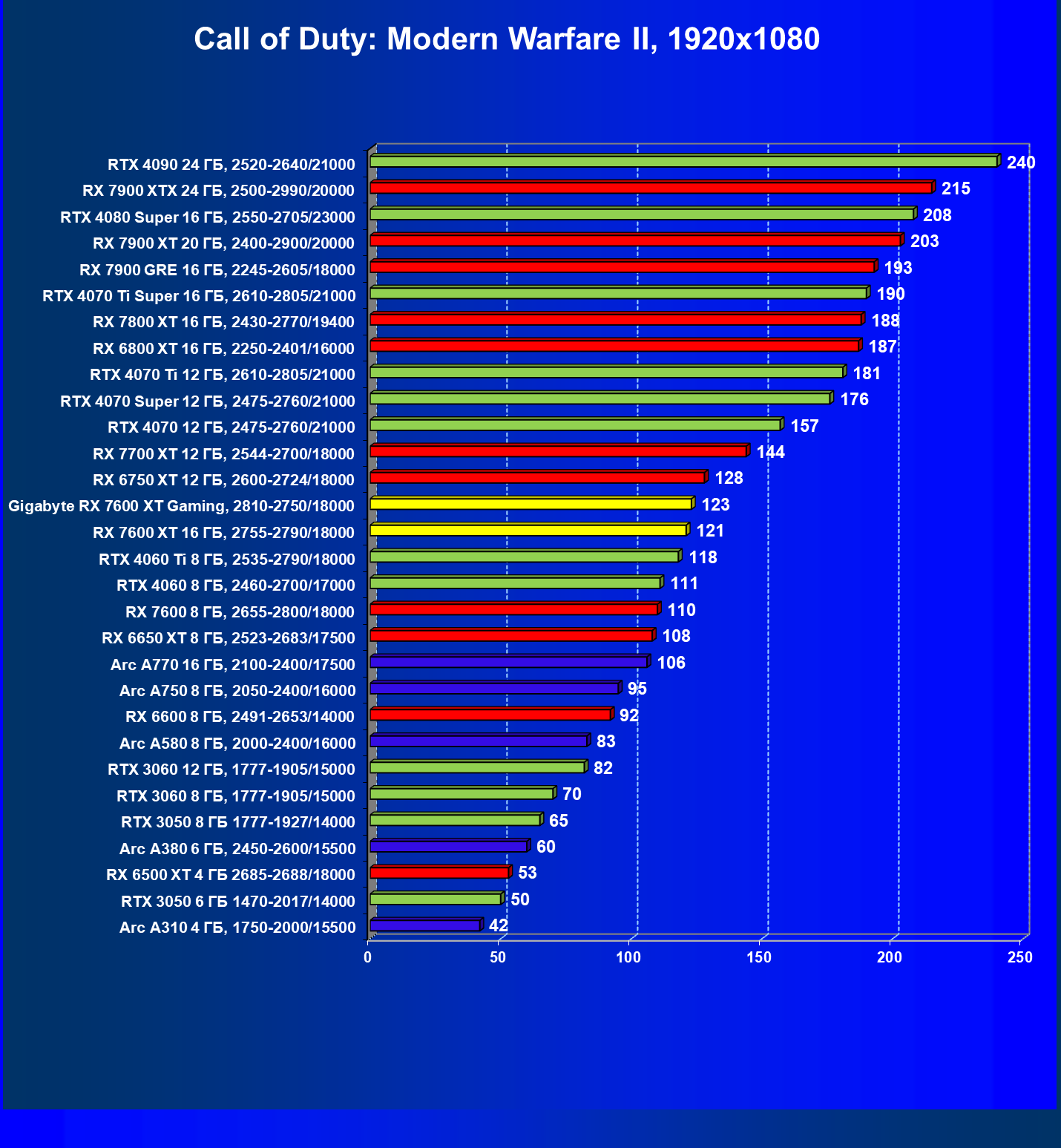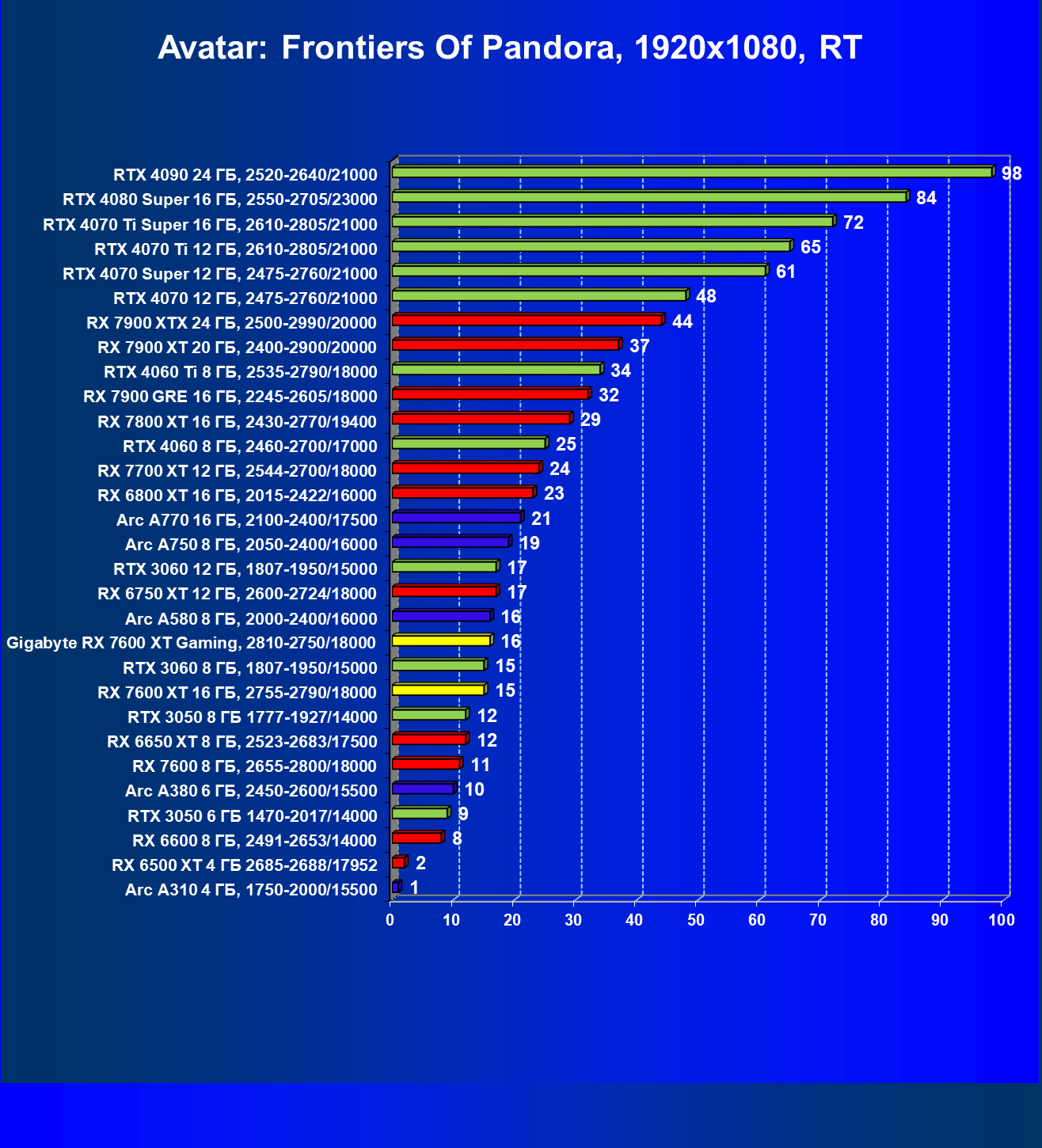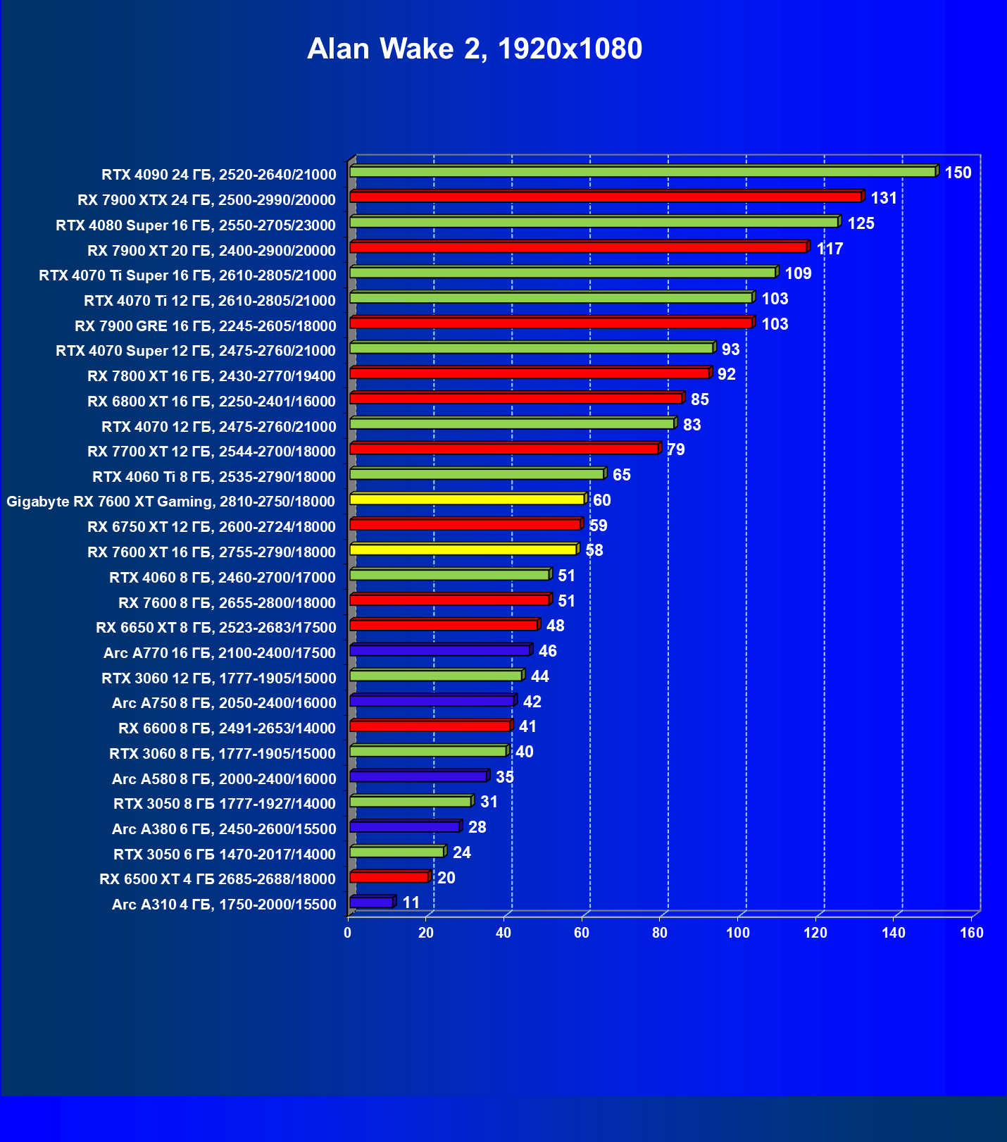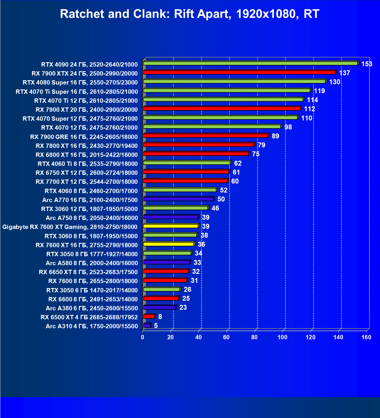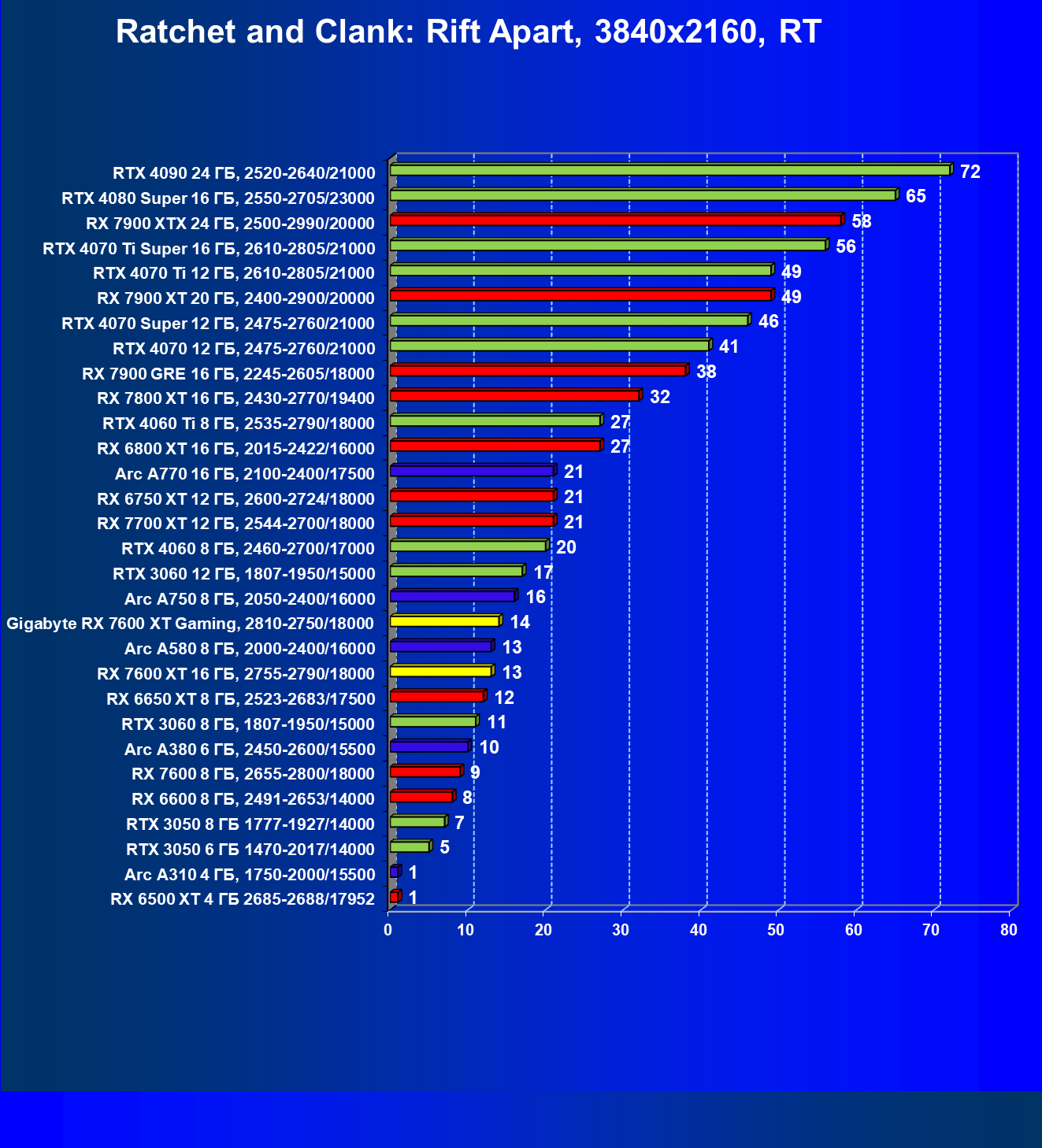 | 05 | Arc A750 8 ГБ, 2050—2400/16000 | 142 | 468 | 33 000 |