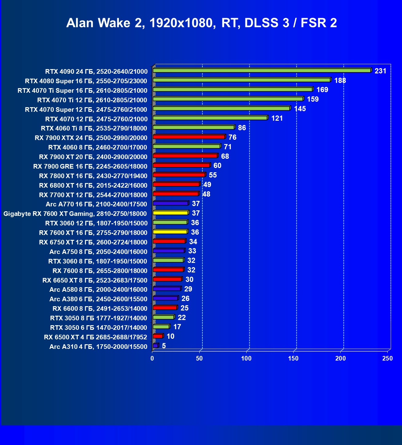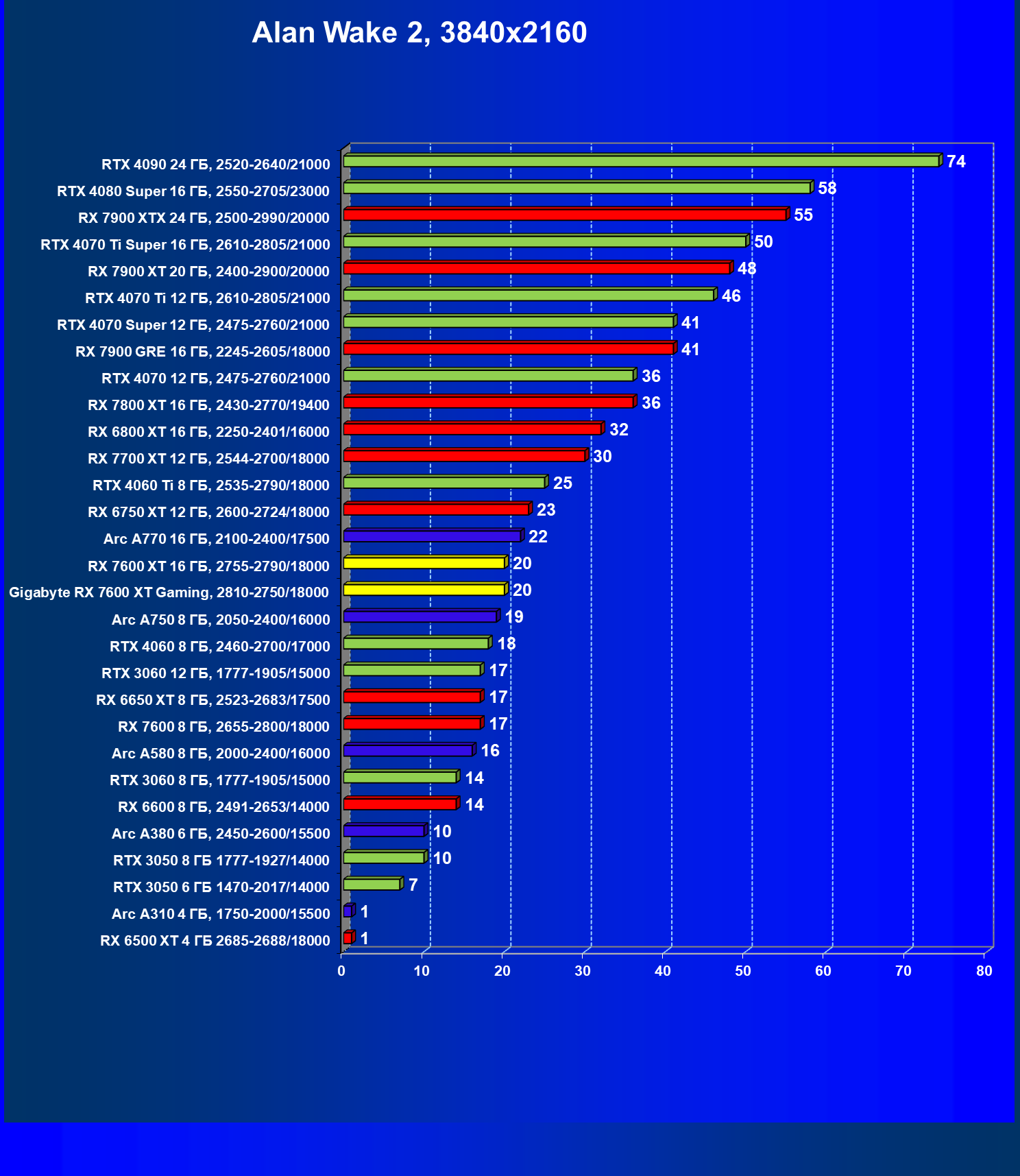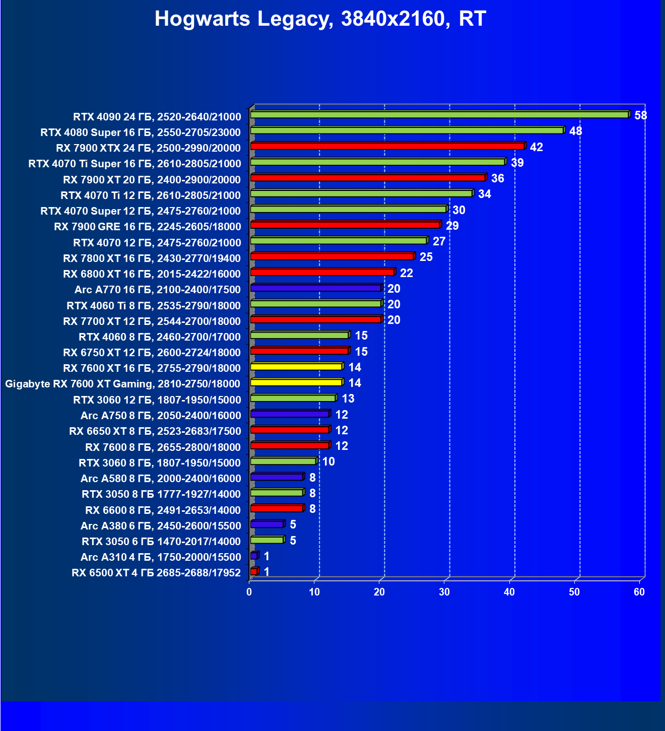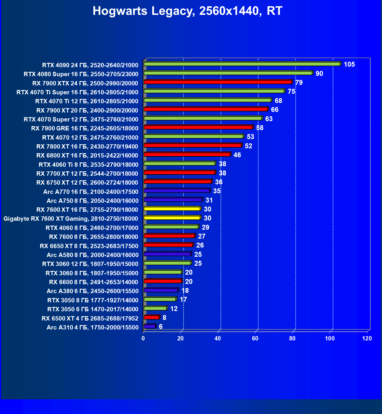 | 05 | Arc A750 8 ГБ, 2050—2400/16000 | 142 | 468 | 33 000 |