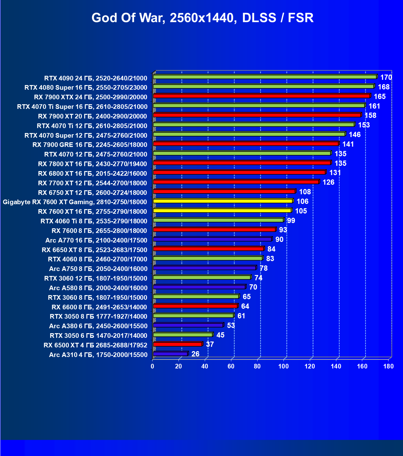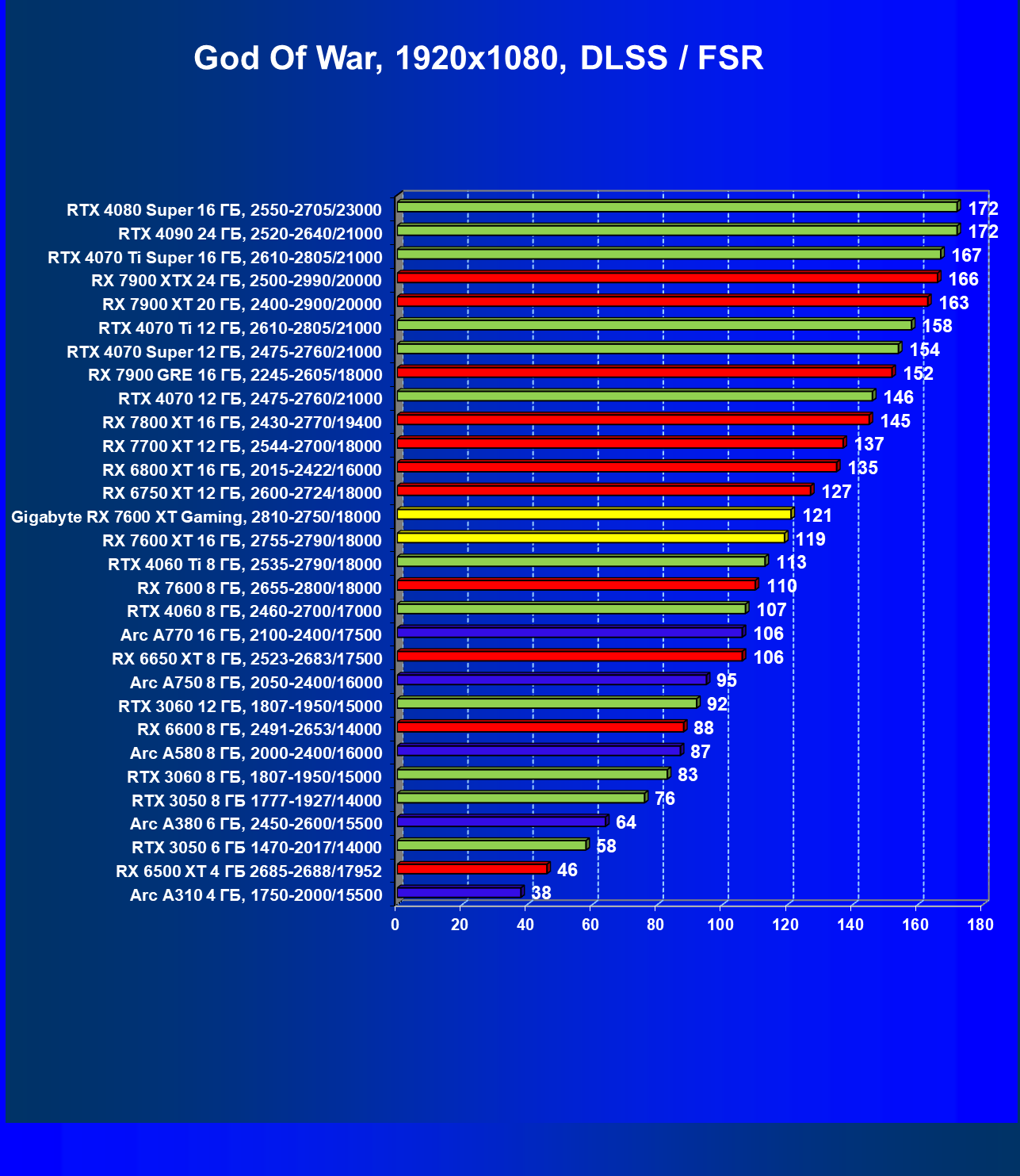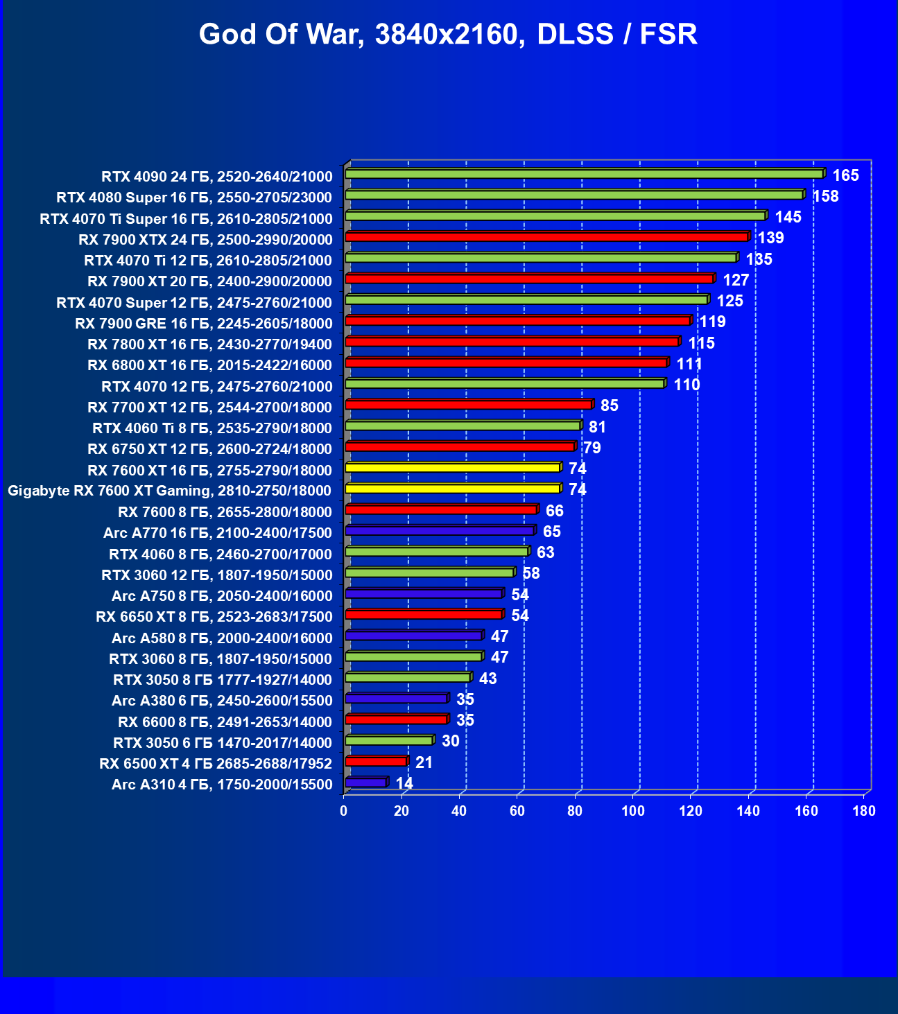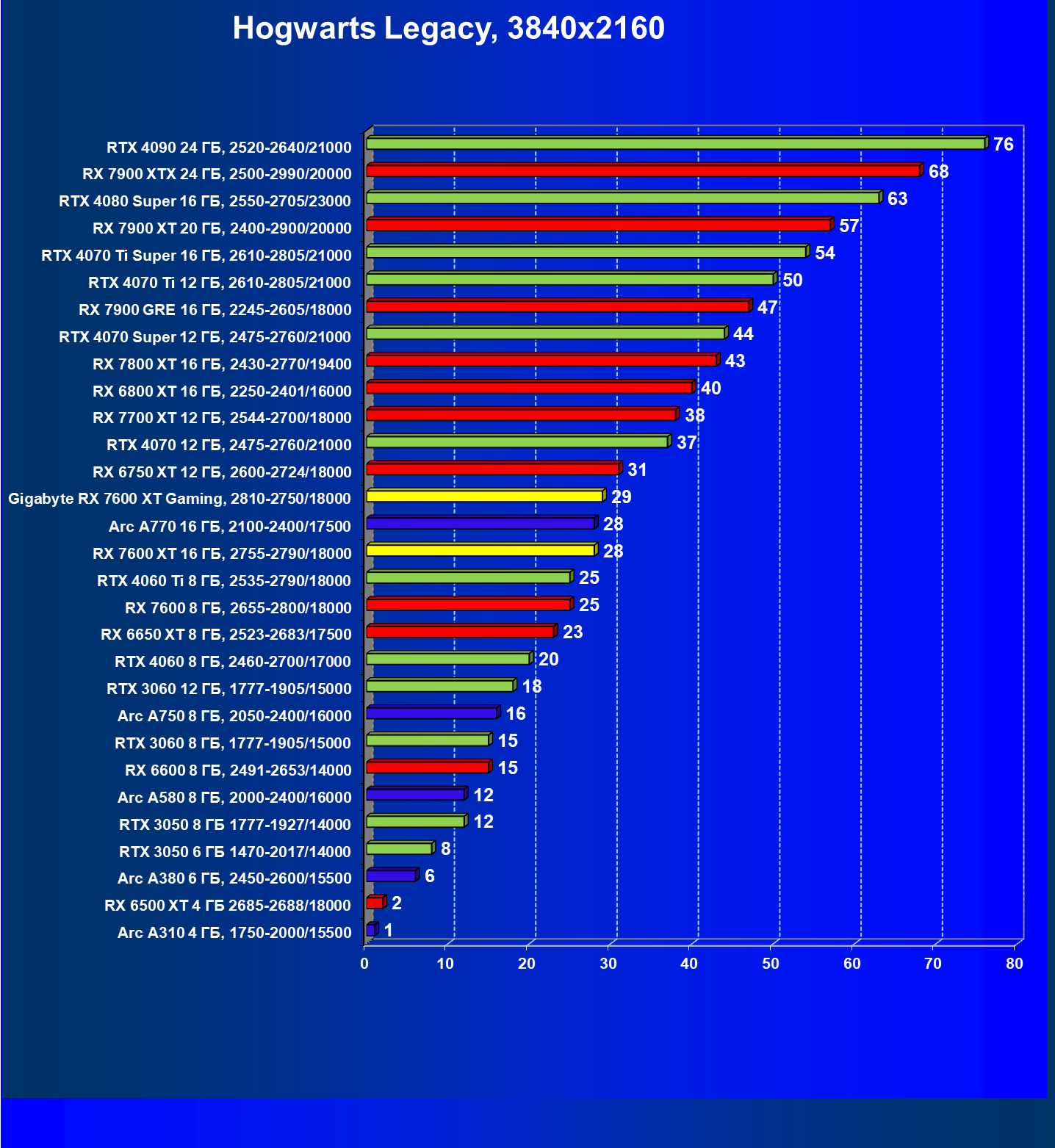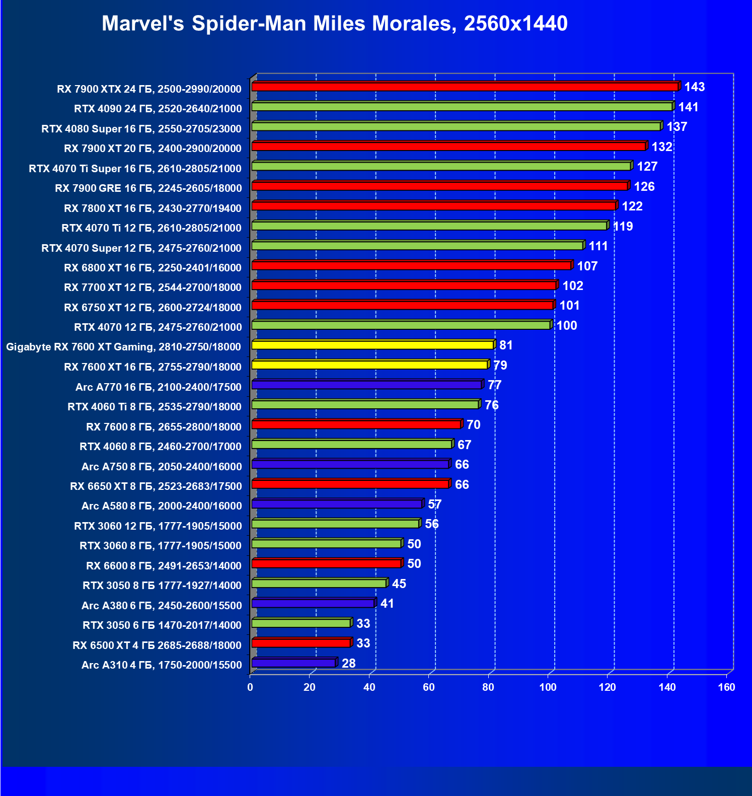 | 05 | Arc A750 8 ГБ, 2050—2400/16000 | 142 | 468 | 33 000 |