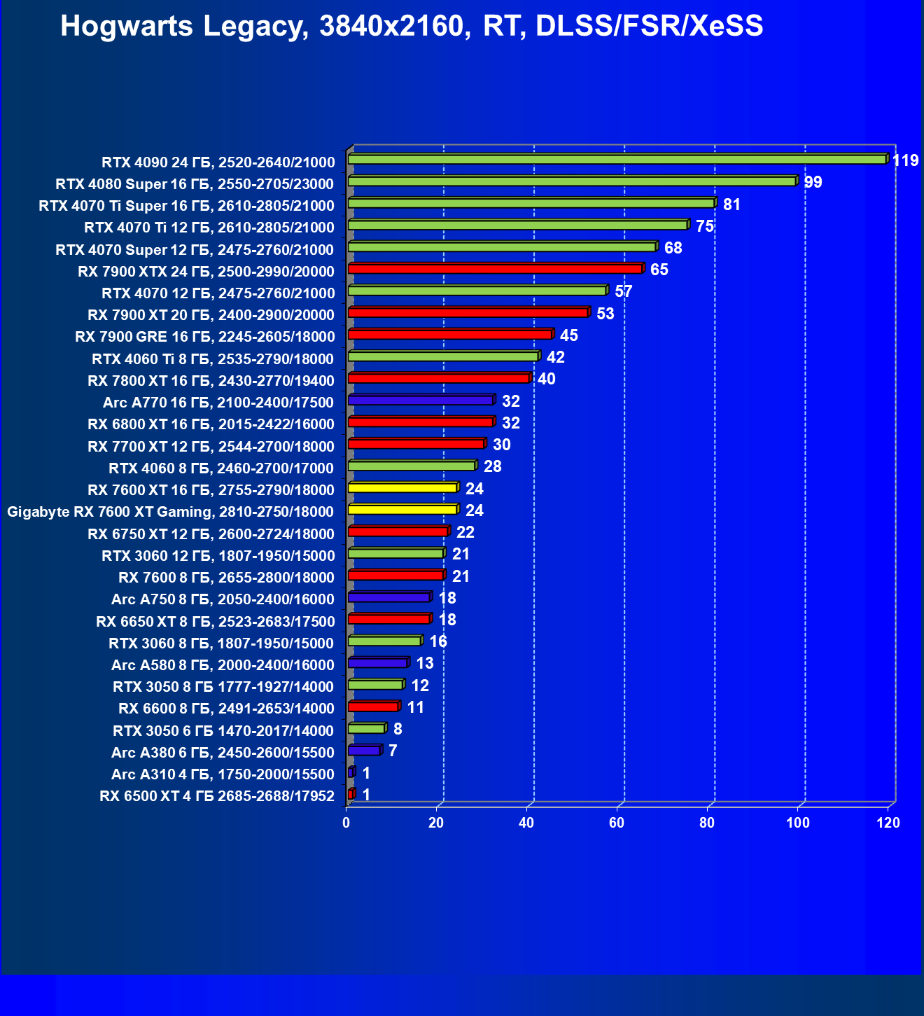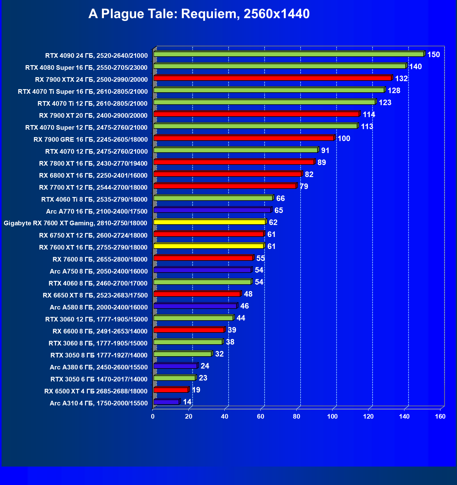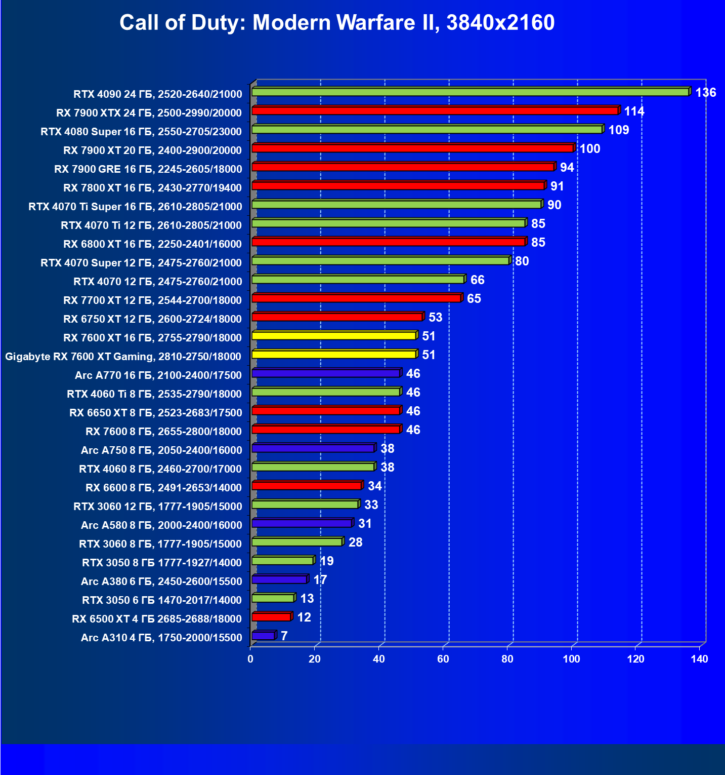 | 13 | Arc A770 16 ГБ, 2100—2400/17500 | 136 | 559 | 41 000 |